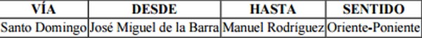 3.- Que, mediante Ord. Nº 406, de 28 de marzo de 2017, de Administrador Municipal de la I. Municipalidad de Santiago y, en relación al referido convenio, se solicita a esta Secretaría Regional decretar como vía exclusiva prioritaria calle Santo Domingo, entre José Miguel de la Barra y Manuel Rodríguez, de lunes a viernes entre las 07:00 y 21:00 horas excepto festivos, pues durante el mes de abril finalizarán los trabajos de remodelación de la citada vía.