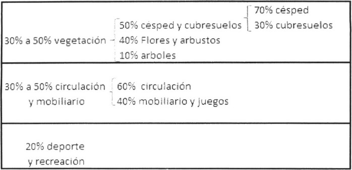 Las áreas destinadas a vegetación deberán ser de un 70% de césped y un 30% de cubresuelo.