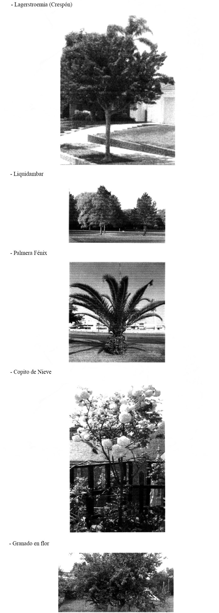 3. Especies arbóreas, en un 10% del área, tales como: Liquidámbar, abedul, palmeras fénix, pata de vaca-Bauhinia forficata-, Paulownia, Lila-Syringa vulgaris-, entre otras.