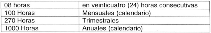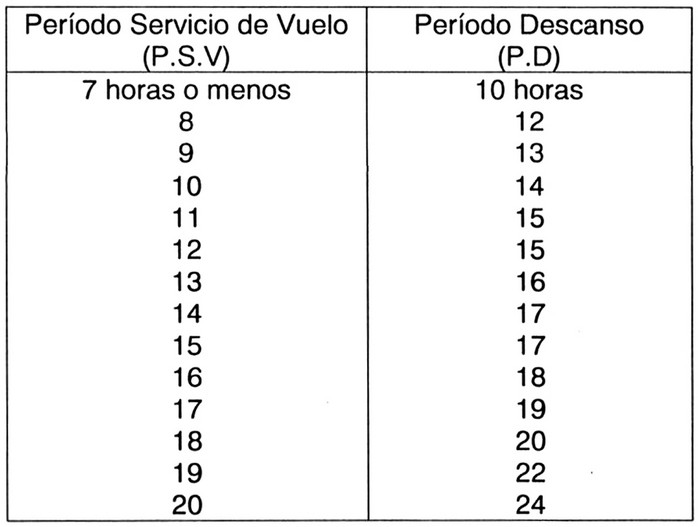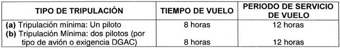 .(2) Periodo de Descanso Semanal: El operador concederá a cada miembro de la Tripulación de Vuelo, Periodos de Descanso semanal de acuerdo a lo siguiente: (i) Treinta y seis (36) horas consecutivas dentro de cada periodo de una (1) semana. (ii) Setenta y dos (72) horas consecutivas dentro de cada periodo de dos (2) semanas. Este descanso podrá ser concedido en el lugar que el tripulante esté prestando sus servicios o en su base habitual de residencia. El descanso semanal es independiente del Periodo de Descanso que corresponde otorgar a un Tripulante después que éste haya efectuado un Periodo de Servicio de Vuelo. (3) Obligaciones y responsabilidades. (i) De los Operadores: (A) Serán responsables de programar los Tiempos de Vuelo (T.V) y los Períodos de Servicio de Vuelo (P.S.V) de manera que no se excedan los límites previstos en esta norma. Tampoco permitirán que se disminuyan los Períodos de Descanso (P.D.) que les correspondan a los tripulantes. En consecuencia, los operadores serán responsables ante la Dirección General de Aeronáutica Civil de que un Tripulante no exceda los límites estipulados en esta norma. (B) Si debido a situaciones especiales, un miembro de la Tripulación de Vuelo excediese un P.S.V, el operador informará de ello a la DGAC, en un plazo no superior a 72 horas de ocurrido el hecho, acompañando la totalidad de los antecedentes que motivaron tal situación y la relación de los Tripulantes que se vieron afectados por dicha medida. La DGAC analizará los antecedentes y resolverá al respecto. Además, el Operador deberá llevar un registro de todos estos casos con la correspondiente firma de los tripulantes involucrados. (C) Especificarán en su Manual de Operaciones la forma en que se cumplirán las disposiciones de la presente Norma. Para tal efecto, deberán consignar en dicho Manual, el número de Tripulantes de Vuelo necesarios para tripular cada tipo de aeronave o para realizar una determinada operación de Trabajo Aéreo. (D) Enviarán dentro de los primeros diez días del mes, la relación del Tiempo de Vuelo total efectuado por cada Tripulante de Vuelo en el mes anterior. (E) Conservar los registros necesarios que permitan demostrar a satisfacción de la DGAC, el cumplimiento de los límites de T.V, P.S.V y P.D, establecidos en la presente norma. Estos antecedentes deberán mantenerse por un período mínimo de seis meses. (ii) De los miembros de la Tripulación: (A) Los P.D para los tripulantes están destinados a prevenir posibles riesgos operacionales causados por la fatiga. Por lo tanto, cada Tripulante durante los Períodos de Descanso evitará toda actividad que limite o afecte su descanso. (B) Para el control de los límites de Tiempo de Vuelo especificados en esta norma, los tripulantes de vuelo computarán para este tiempo, todas las horas voladas tanto en operaciones privadas, comerciales y deportivas. Para estos efectos, el tripulante de vuelo deberá informar al operador todas las horas de vuelo que realice ajenas a la empresa. (C) Operación de aviones y helicópteros en trabajos aéreos. (1) Límites específicos de Tiempo de Vuelo y Periodos de Servicio de Vuelo de acuerdo al Tipo de Tripulación de Vuelo a utilizar: Tabla 1: