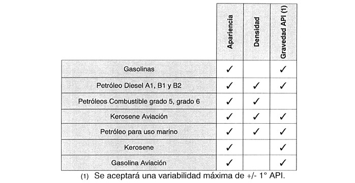 3.2.2 Los ensayos deberán ser los descritos en la Tabla I del Anexo 1 de esta resolución, "Ensayos abreviados a realizar en la recepción del producto desde buque tanque, en la recepción del producto desde oleoductos y en la liberación de los productos en plantas de almacenamiento y distribución".