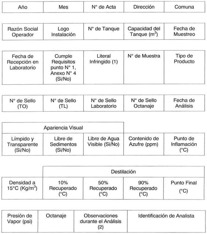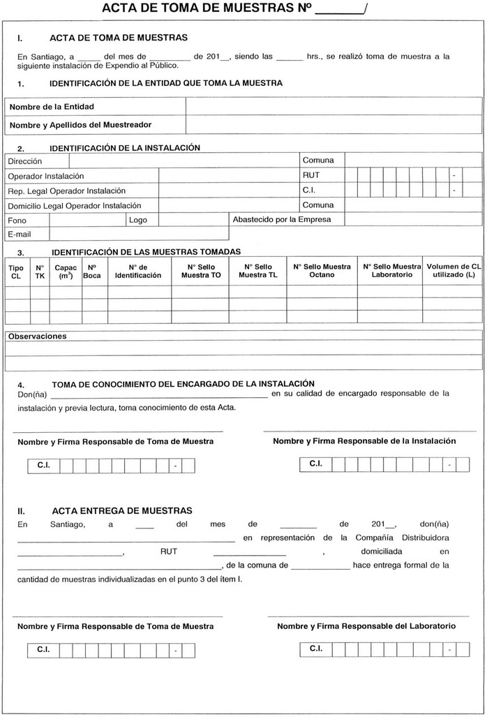 6.3.5 El muestreo de los tanques de las instalaciones deberá registrarse y consignarse en el Acta respectiva, según se indica en el modelo adjunto en el Anexo 4 de esta resolución, "Acta de Toma de Muestra y Etiquetado". Además, se deberán identificar y rotular las muestras de acuerdo al formato de etiquetado indicado en ese mismo Anexo.