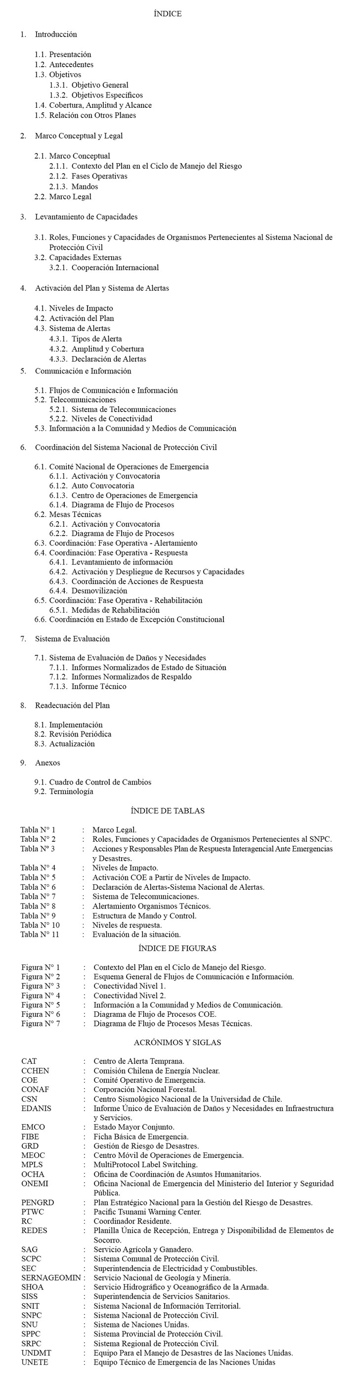 Apruébase, el Plan Nacional de Emergencia, como un instrumento de carácter indicativo y general, que establece las acciones de respuesta, ante situaciones de emergencia, desastre y catástrofe, roles, funciones, capacidades y competencias de los organismos del Sistema Nacional de Protección Civil.