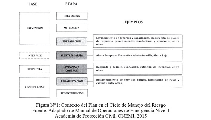 El Ciclo de Manejo del Riesgo contempla tres fases: Prevención, Respuesta y Recuperación (ver figura N°1), dentro de las cuales, el Plan Nacional de Emergencia responde, en gran medida, a la fase de Respuesta y en menor medida a la interface correspondiente a la etapa de Alerta/Alarma y a la fase de Recuperación (Etapa de Rehabilitación).