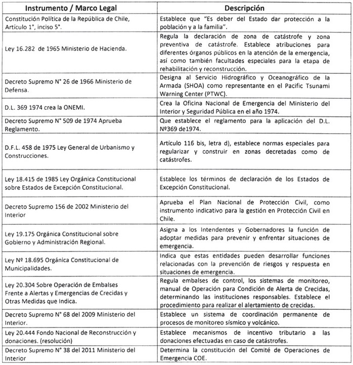Lo dispuesto en la Constitución Política de la República de Chile; la Ley N° 18.575 Orgánica Constitucional de Bases Generales de la Administración del Estado; la Ley N° 19.880 de Bases de los Procedimientos Administrativos que Rigen los Órganos de la Administración del Estado; la Ley N° 18.415 Orgánica Constitucional sobre Estados de Excepción Constitucional; la Ley N° 19.175 Orgánica Constitucional sobre Gobiernos Regionales y Administración Regional; decreto N° 104 de 28 de enero de 1977, que fija el texto refundido, coordinado y sistematizado del título I de la Ley N° 16.282; la Ley N° 16.282 que fija disposiciones permanentes para casos de sismos o catástrofes; la Ley N° 19.095 que modifica Ley N° 16.282, en lo relativo a normas para casos de sismos y Catástrofes; la Ley N° 20.304 sobre operación de embalses frente a alertas y emergencias de crecidas y otras medidas que indica; la Ley N° 20.444 que crea el Fondo Nacional de la Reconstrucción y establece mecanismos de incentivo tributario a las donaciones efectuadas en caso de catástrofe; la Ley N° 19.061 que establece normas sobre fomento a obras de riego en zonas afectadas por sismos o catástrofes; la Ley N° 20.478 sobre recuperación y continuidad en condiciones críticas y de emergencia del sistema público del sistema público de telecomunicaciones; la Ley N° 19.886 de bases sobre contratos de suministros y prestación de servicios; el decreto con fuerza de ley N° 725 de 11 de diciembre de 1967, que aprueba el Código Sanitario, del Ministerio del Interior; el decreto supremo N° 156 de 12 de marzo de 2002, que aprueba el Plan Nacional de Protección Civil, del Ministerio del Interior; el decreto supremo N° 38 de 11 de enero de 2011, que modifica decreto supremo N° 156, de 2002, y determina constitución de los Comités de Operaciones de Emergencia, del Ministerio del Interior y Seguridad Pública; el decreto supremo N° 697 de 3 de junio de 2015, que modifica decreto supremo N° 156, de 2002, y reemplaza la Encuesta Familiar Única por la Ficha Básica de Emergencia; el decreto supremo N° 26 de 11 de enero de 1966, que designa al Servicio Hidrográfico y Oceanográfico de la Armada como representante oficial de Chile ante el Sistema Internacional de Alarma Tsunami del Pacífico y crea un Sistema Nacional de Maremotos, del Ministerio de Defensa; el decreto supremo N° 68 de 28 de enero de 2009, que establece un sistema de coordinación permanente de procesos de monitoreo sísmico y volcánico, del Ministerio del Interior; el decreto supremo N° 138 de 6 de febrero de 2010, que aprueba reglamento de Ley N° 20.304, sobre operación de embalses frente a alertas y emergencias de crecidas y otras medidas que indica, del Ministerio de Obras Públicas; el decreto N° 708 de 2 de octubre de 1989, que reorganiza el Servicio de Búsqueda y Salvamento Aéreo (SAR), del Ministerio de Defensa; el decreto supremo N° 1.512 de 24 de octubre de 2016, que aprueba la Política Nacional para la Gestión del Riesgo de Desastres, del Ministerio del Interior y Seguridad Pública; el decreto supremo N° 733 de 11 de junio de 1982, que deroga decretos supremos Nos 1.027 de 1976 y 1.040 de 1979, y aprueba normas que indica, del Ministerio de Agricultura; la resolución exenta N° 2.415 de 20 de febrero de 2014, que aprueba el Manual de Procedimientos de la Utilización de Recursos y los Bienes en caso de Emergencia o Catástrofe, de la Subsecretaría del Interior; la resolución exenta N° 1.067 de 30 de octubre de 2015, que aprueba el Plan Estratégico Nacional para la Gestión del Riesgo de Desastres 2015-2018, de la Oficina Nacional de Emergencia del Ministerio del Interior y Seguridad Pública; la resolución exenta N° 931 de 3 de noviembre de 2015, que aprueba el Plan Nacional de Emergencias, de la Oficina Nacional de Emergencia del Ministerio del Interior y Seguridad Pública; y la resolución N° 1.600 del año 2008 de la Contraloría General de la República.