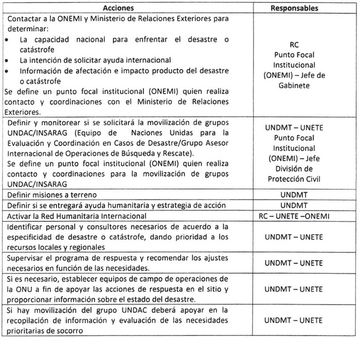 La responsabilidad de la activación del Plan recae en el Coordinador Residente a solicitud del Ministro de Relaciones Exteriores y el Equipo Para el Manejo de Desastres de las Naciones Unidas (UNDMT), que a su vez es apoyado técnicamente por el Equipo Técnico de Emergencia de las Naciones Unidas (UNETE).