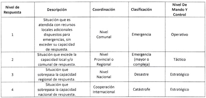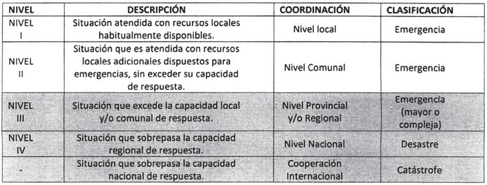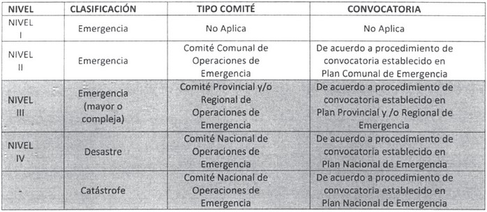 Los niveles de activación para la respuesta están en función de los daños causados, su magnitud, impacto y capacidad de respuesta. Para lo cual, existe una clasificación de los niveles de impacto (ver tabla Nº 4). De acuerdo a esta clasificación el Plan se activa a partir de una situación de emergencia, desastre o catástrofe, es decir, a partir del Nivel III.