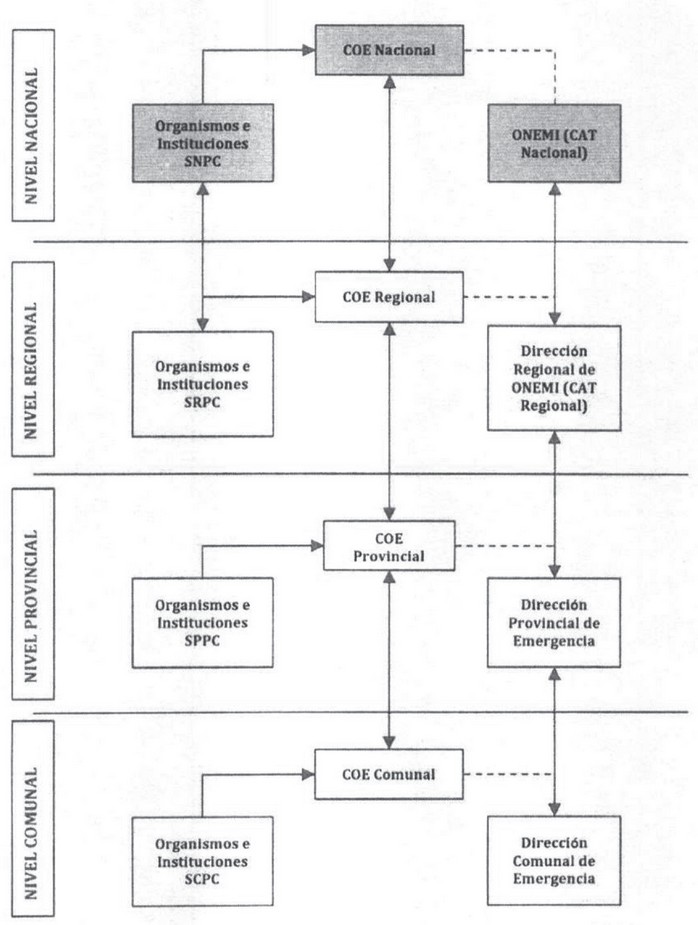 El Marco de Sendai para la Reducción de Riesgo de Desastres 2015-2030, plantea en la Prioridad 4, a nivel nacional y local: "Preparar o examinar y actualizar periódicamente los planes, políticas y programas de preparación y contingencia para casos de desastre". Considerando esta indicación, en esta misma línea, el PENGRD plantea la formulación del formato del Plan Nacional de Emergencia, validado por la Oficina Nacional de Emergencia del Ministerio del Interior y Seguridad Pública ONEMI.
