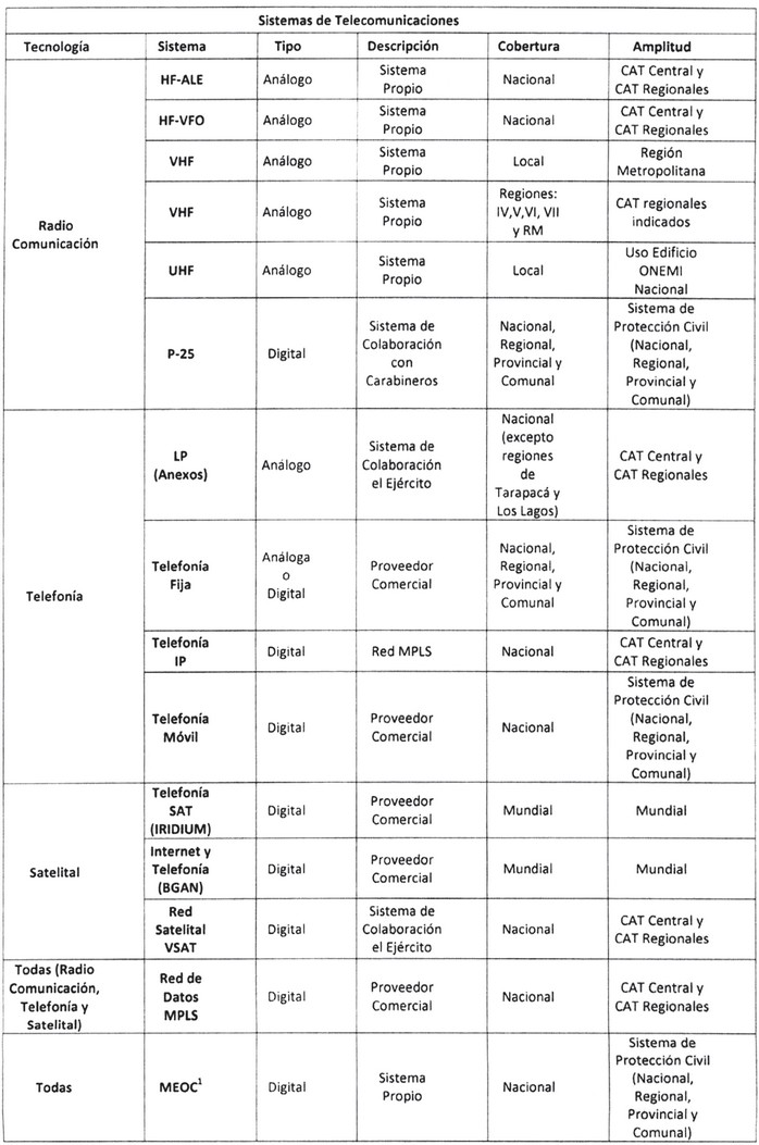 Sistema Nacional de Protección Civil: Es la organización de diversos organismos bajo la coordinación de la Oficina Nacional de Emergencia -ONEMI- del Ministerio del Interior y Seguridad pública, que comparten la meta de contribuir a la seguridad de las personas, sus bienes y el medio ambiente. Sistema que coordina recursos humanos, económicos y técnicos estableciendo protocolos de coordinación.