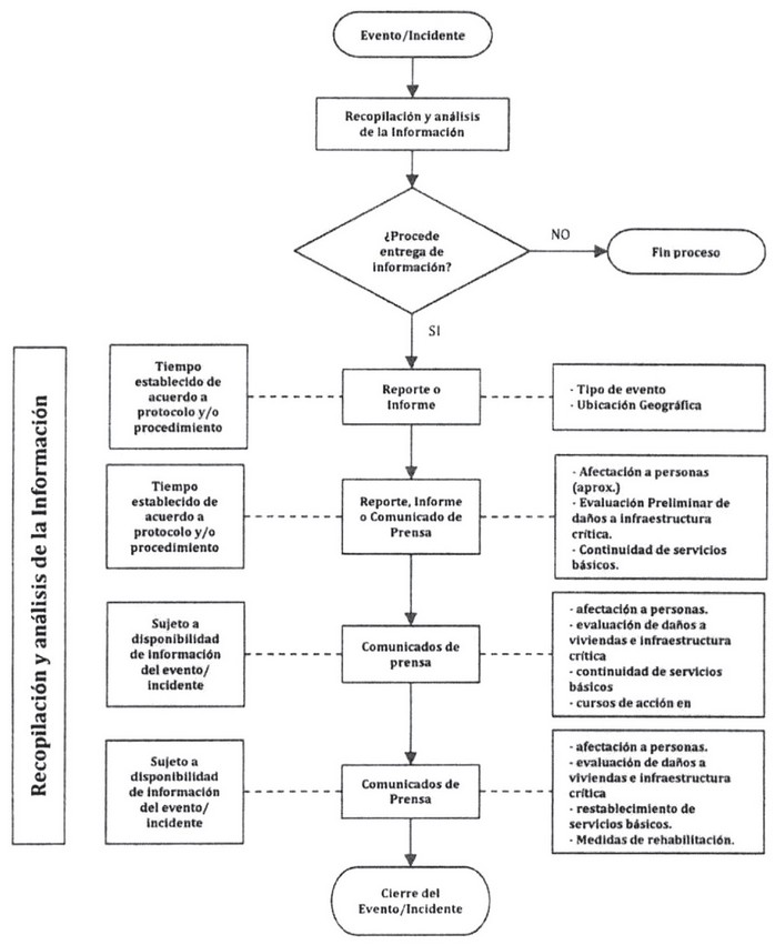 Dentro del manejo de información es necesario considerar dos áreas de trabajo; la interna, es decir, la correspondiente a toda aquella información que es propia de cada institución, para coordinar sus recursos y acciones; y, la externa, que es toda aquella información que es traspasada de un organismo a otro, a través de la cadena de comunicaciones, con el objetivo de lograr una mejor toma de decisiones de respuesta en los niveles que corresponda, como igualmente informar adecuada y oportunamente a la opinión pública.