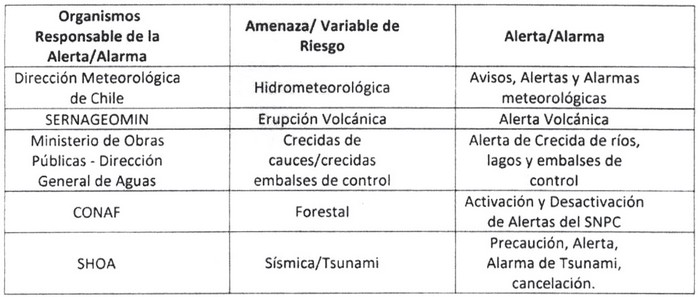 Alarma: Es la primera acción de respuesta y corresponde al aviso cierto, de la inminencia o presencia de una amenaza. La alarma, implica a su vez, una señal por medio de la cual se informa a la comunidad con instrucciones específicas, y a los organismos del sistema de protección civil que activen procedimientos ad-hoc a la situación de emergencia.