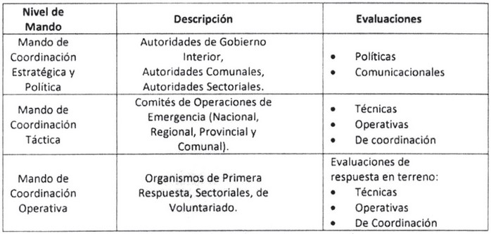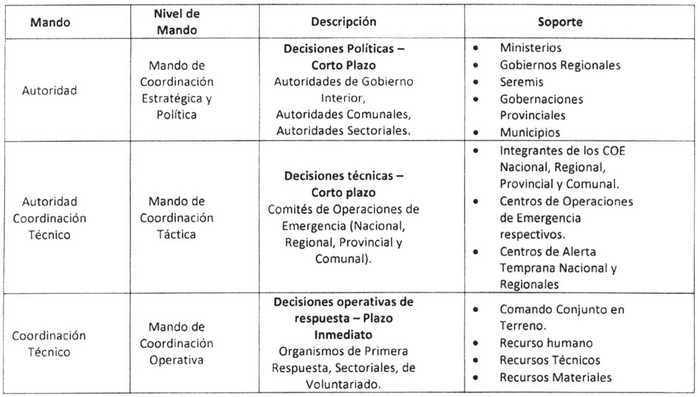 . Mando de Coordinación: es ejercido por los Directores de Protección Civil en función de la jurisdicción territorial-administrativa respectiva (nacional, regional, provincial y comunal). Su principal función es la coordinación de las instituciones y los recursos destinados para la respuesta a eventos o incidentes y la relación con la autoridad de Gobierno Interior. El Mando de Coordinación es ejercido por: