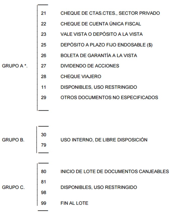 Los demás documentos pagaderos por la Cámara de Compensación, tales como vales vista, depósitos a plazo fijo, boletas de garantía y otros cuyos códigos y nombres se indican en el Anexo N° 2 de este Capítulo, deben ajustarse a lo siguiente: