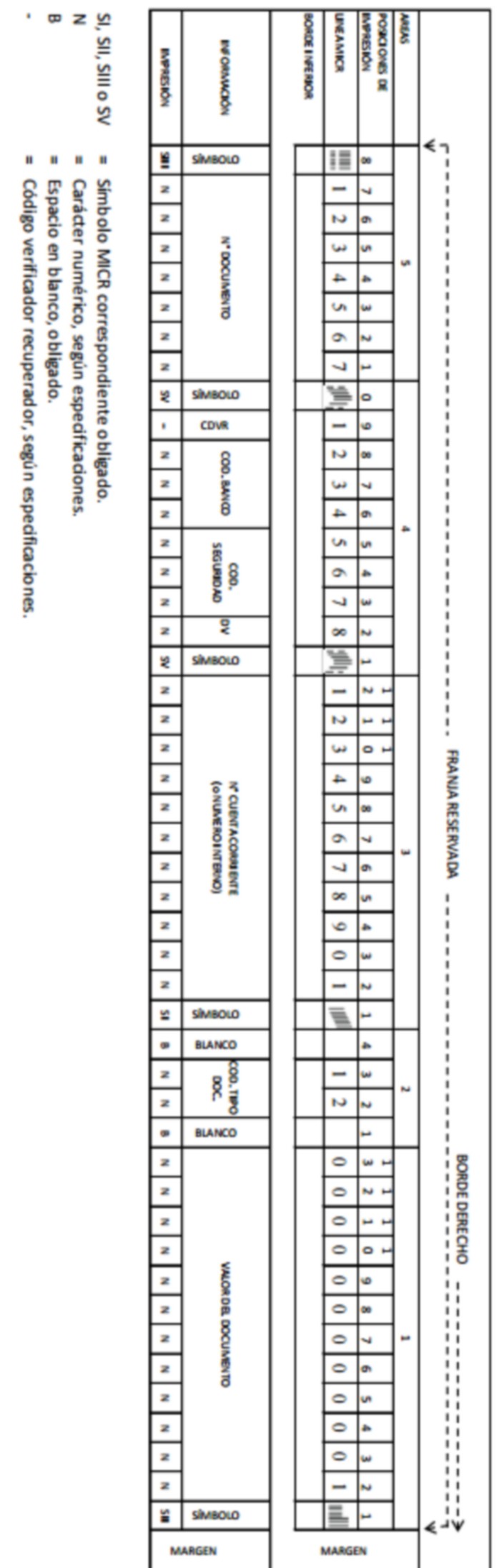 m) Espacio para caracteres magnéticos. Se considera un espacio ubicado en la parte inferior del documento, sector que no puede llevar ningún tipo de impresión por estar destinado a los caracteres magnéticos de que trata el N° 4 de este título.