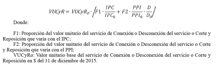 El valor unitario del corte y reposición (VUCyR) se establece mediante la siguiente fórmula de indexación, la que se aplica directamente sobre el valor base, VUCyRo.