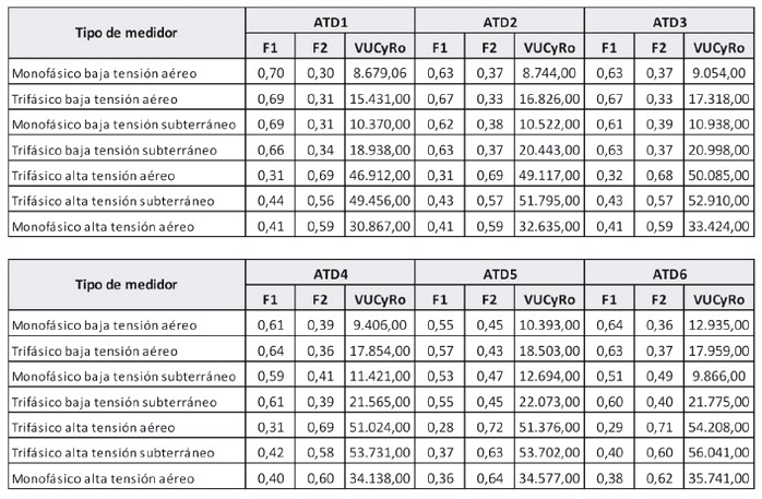 Para cada área típica de distribución, el valor de VUCyR0 y de los ponderadores F1 y F2 a emplear en la fórmula de indexación, se presentan a continuación de acuerdo al tipo de medidor: