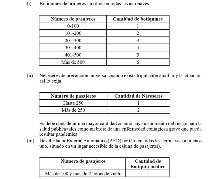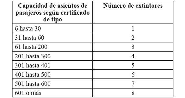 .(E) Todo agente extintor que se utilice en los extintores de incendios incorporados en los receptáculos destinados a desechar toallas, papel o residuos en los lavabos de un helicóptero cuyo certificado de aeronavegabilidad individual se haya expedido por primera vez el 31 dic 2011 o después y todo agente extintor empleado en los extintores de incendios portátiles de un helicóptero cuyo certificado de aeronavegabilidad individual haya sido expedido por primera vez el 31 de diciembre de 2018 o después, no será de un tipo de los enumerados en el protocolo de Montreal aprobado por el DECRETO SUPREMO (Relaciones Exteriores) N° 238 DEL 08 MAR 1990 (publicado el 28 abr 1990) relativo a las sustancias que agotan la capa de ozono. (iii) Un asiento para cada persona mayor de dos (2) años. Para menores a la edad indicada, estos pueden viajar en los brazos de un adulto que ocupe un asiento equipado con el respectivo cinturón de seguridad o podrá hacer uso de sillas certificadas para su uso en aviación.(iv) Un cinturón de seguridad para cada asiento. (v) Arneses de seguridad para cada asiento de los miembros de la tripulación de vuelo y asiento de tripulante auxiliar. El arnés de seguridad de cada asiento de piloto deberá incluir un dispositivo que sujete el torso del ocupante en caso de desaceleración rápida. El arnés de seguridad de cada asiento de piloto deberá incluir un dispositivo destinado a impedir que el piloto que sufra una incapacitación súbita dificulte el acceso a los mandos de vuelo; y (vi) De no contar con fusibles automáticos, deberá contar con fusibles de repuesto de los amperajes apropiados para reemplazar aquellos que sean accesibles en vuelo. (vii) Claves de señales de tierra a aire para fines de búsqueda y salvamento (viii) Micrófonos de vástago o de garganta cuando la aeronave se encuentre bajo el nivel de transición/altitud que permitan la comunicación entre los miembros de la tripulación de vuelo que se encuentren en servicio en el compartimiento de pilotos. (ix) Toda aeronave deberá disponer para uso de la tripulación durante un vuelo nocturno, de una linterna operativa, de rápido acceso desde el asiento de cada miembro de la tripulación. (x) Megáfonos. Cuando corresponda, deberá proveerse de un sistema de comunicación tipo megáfono de batería independiente, para ser usado para la dirección de la evacuación de la aeronave en caso de emergencia, la que debe tener la siguiente instalación: (a) Un megáfono en cada aeronave de capacidad de sesenta (60) a noventa y nueve (99) pasajeros, situado en lugar accesible y de fácil uso desde el puesto de un tripulante auxiliar. (b) Dos (2) megáfonos en cada aeronave con capacidad de cien (100) o más y menos de ciento noventa (190) pasajeros, colocados uno en la parte delantera y otro en la parte trasera del compartimiento de pasajeros, en lugares accesibles y de fácil uso desde los puestos de los tripulantes auxiliares. (c) Tres (3) megáfonos en cada aeronave con capacidad de más de ciento noventa (190) pasajeros colocados uno en la parte delantera, otro en la parte central y otro en la parte trasera del compartimiento de pasajeros, en lugares accesibles y de fácil uso, desde los puestos de los tripulantes auxiliares. (xi) El equipamiento señalado, deberá cuando corresponda: (A) Ser inspeccionado regularmente de acuerdo a los períodos de inspección establecidos en las especificaciones técnicas del producto para asegurar su condición servible y disponibilidad inmediata para cumplir con los propósitos de emergencia propuestos; (B) Estar fácilmente accesible a la tripulación y con respecto al equipamiento localizado en el compartimiento de pasajeros, a los pasajeros; (C) Estar claramente identificado y rotulado para indicar su método de operación; y (D) Estar rotulado indicando la fecha de vigencia cuando sea transportado en un compartimiento o container (E) Los períodos de inspección señalados por el fabricante se deberán incluir en el respectivo Programa de Mantenimiento de la aeronave. (xii) Cuando corresponda el avión estará equipado con medios para asegurar que se comunique a los pasajeros la información e instrucciones siguientes: (A) cuando han de ajustarse los cinturones de seguridad (B) cuando y como ha de utilizarse el equipo de oxígeno, si se exige provisión de oxígeno a bordo. (C) no fumar (D) ubicación y uso de los chalecos salvavidas si se exige llevar a bordo este dispositivo (E) ubicación del equipo de emergencia (F) ubicación y modo de abrir las salidas de emergencia. (xiii) Un hacha para cada avión de 19 o más pasajeros. (2) Para todos los aviones que vuelen sobre el agua. Todo avión deberá llevar un chaleco salvavidas o cojín con capacidad de flotación que cumplan con las TSO C13 y C72 respectivamente, para cada persona que vaya a bordo, situado en lugar fácilmente accesible desde el asiento de la persona que haya de usarlo, según se indica en los siguientes párrafos: (i) un chaleco salvavidas cuando vuele sobre el agua a una distancia de más de 93 km (50 NM) de la costa; o (ii) un chaleco salvavidas cuando vuele en ruta sobre el agua a una distancia de la costa superior a la de planeo, o (iii) un chaleco salvavidas o cojín con capacidad de flotación cuando en su trayectoria de despegue o aterrizaje exista la probabilidad de un amarizaje. (3) Para todas las aeronaves que realicen vuelos prolongados sobre el agua. (i) Además del equipo prescrito en 92.407 (b)(1), el equipo que se indica a continuación deberá ser instalado en todas las aeronaves utilizadas en vuelos prolongados sobre agua. (A) Balsas salvavidas, en número suficiente para alojar a todas las personas que se encuentren a bordo, ubicadas de forma que facilite su empleo si fuera necesario, provistas del equipo de salvamento incluso medios para el sustento de la vida y kit de supervivencia que sea apropiado para el vuelo que se vaya a emprender. (B) Equipo necesario por cad