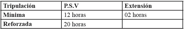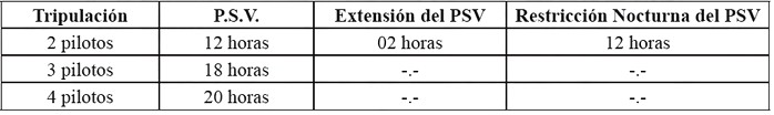 .(ii) El Período de Servicio de Vuelo y la Restricción Nocturna de P.S.V. se aplican dentro de un Período de 24 horas consecutivas. (iii) El Explotador no podrá programar más de 12 horas de P.S.V. dentro de un periodo de 24 horas consecutivas, salvo que se aplique la extensión de 02 horas. (iv) En el caso que se incorpore a la tripulación un Operador de Sistemas, a éste se le aplicarán las mismas horas de P.S.V, Extensión y Restricción Nocturna establecidas para los pilotos. (v) Los Tripulantes de Vuelo que en un Período de Servicio de Vuelo hayan cumplido más del 50% del Período Nocturno, podrán efectuar sólo un segundo Período de Servicio de Vuelo nocturno consecutivo el cual no podrá exceder el 50% del Período Nocturno. (vi) El Período de Servicio de Vuelo de 12 horas continuas de la Tripulación Mínima, podrá extenderse hasta catorce (14) horas ante la ocurrencia, en el respectivo PSV, de contingencias meteorológicas, emergencias médicas, necesidades calificadas de mantenimiento de la aeronave consignadas en el MEL (Minimum Equipment List), o bien cuando el Comandante de Aeronave por razones de seguridad así lo determine. (viii) En todos los casos anteriores, el Explotador deberá mantener hasta por seis meses un registro disponible, para requerimiento y análisis de la DGAC donde se consignen las razones que se tuvo en consideración para la extensión del PSV. Este registro debe considerar la firma del Comandante de la Aeronave. (ix) Cuando el Tripulante de Vuelo realice un Periodo de Servicio, podrá iniciar un P.S.V. siempre y cuando la suma de ambos tiempos no excedan los límites establecidos para un P.S.V. (2) Límites de Tiempo de Vuelo (TV). (i) Los límites de Tiempo de Vuelo máximos establecidos para el Tripulante de Vuelo serán los siguientes:
