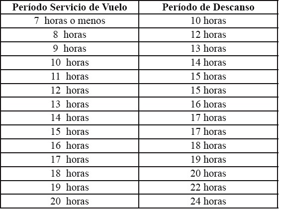 .(ii) Si un Tripulante de Vuelo efectuare un Período de Servicio de 8 horas o más, para iniciar un Período de Servicio de Vuelo, se deberá considerar previamente un descanso mínimo de once (11) horas. (iii) Al Tripulante de Vuelo, que realiza un PSV que incluya un cambio de Longitud Geográfica de cuarenta y cinco grados (45°) o más, se le deberá aumentar en dos horas el Período de Descanso correspondiente. En forma progresiva se continuará incrementando este descanso en treinta minutos, por cada quince grados de Longitud Geográfica adicional. (4) Reposo. (i) Cuando el vuelo se realice con tripulación reforzada, el explotador deberá disponer de un lugar a bordo de la aeronave, con condiciones confortables, para el reposo de la Tripulación de Vuelo. (ii) Este lugar de reposo deberá ser ocupado por las tripulaciones de vuelo que sean relevadas de sus funciones con el propósito de no sobrepasar los límites establecidos de Tiempo de Vuelo (iii) Los Explotadores, deberán proponer para aprobación de la DGAC, los lugares destinados al reposo de la Tripulación de Vuelo en los distintos tipos de materiales aéreos que operen. (iv) Los lugares de reposo autorizados por la DGAC, deben ser incluidos en el Manual de Operaciones del explotador, de acuerdo a los requisitos establecidos en esta norma. (c) TRIPULANTES AUXILIARES (1) Período de Servicio de Vuelo (i) Los límites de Período de Servicio de Vuelo serán los siguientes: