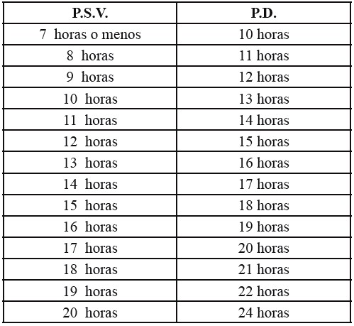 .(v) Los Tripulantes Auxiliares que en un Período de Servicio de Vuelo hayan cumplido más del 50% del Período Nocturno, podrán efectuar sólo un segundo Período de Servicio de Vuelo nocturno consecutivo el cual no podrá exceder el 50% del Período Nocturno. (vi) El Período de Servicio de Vuelo de 12 horas continuas de la Tripulación Mínima, podrá extenderse hasta catorce (14) horas ante la ocurrencia, en el respectivo P.S.V., de contingencias meteorológicas, emergencias médicas, necesidades calificadas de mantenimiento de la aeronave consignadas en el MEL (Minimum Equipment List) o bien cuando el Comandante de Aeronave por razones de seguridad así lo determine. (vii) En todos los casos anteriores, el Explotador deberá mantener hasta por seis meses un registro disponible, para requerimiento y análisis de la DGAC donde se consignen las razones que se tuvo en consideración para la extensión del Período de Servicio de Vuelo. Este registro debe considerar la firma del Comandante de la Aeronave. (viii) Cuando el Tripulante Auxiliar realice un Periodo de Servicio, podrá iniciar un P.S.V. siempre y cuando la suma de ambos tiempos no excedan los límites establecidos para un P.S.V. (ix) El P.S.V se reducirá en treinta minutos por cada aterrizaje superior a cinco. Esta norma será aplicable solamente a la Tripulación Auxiliar Mínima. (2) Períodos de Descanso (P.D) (i) El Explotador no podrá programar a un Tripulante Auxiliar para un PSV, cuando no se haya dado cumplimiento a los Períodos de Descanso que se indican a continuación: