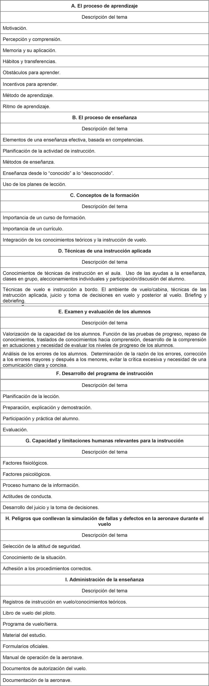 APÉNDICE "E" CURSO PARA INSTRUCTOR DE VUELO (a) Aplicación. Establece los requisitos para el curso de instructor de vuelo, en la categoría de avión y helicóptero. (b) Requisitos de inscripción. El alumno deberá antes de iniciar la fase de instrucción de vuelo: (1) Contar con una licencia de piloto comercial o superior vigente con la habilitación de categoría y clase apropiada a la aeronave en la que pretende instruir; y (2) ser titular de una habilitación de vuelo por instrumentos vigente, si pretende ser instructor de esta habilitación. (c) Definiciones y abreviaturas. Las señaladas en la sección 141.1 de esta norma técnica aeronáutica. (d) Conocimientos teóricos. El curso teórico de formación para instructor de vuelo, será desarrollado en un mínimo de treinta (30) horas y deberá comprender las siguientes materias en técnicas de enseñanza y aprendizaje, además de la actualización de conocimientos aeronáuticos correspondiente a las licencias de piloto privado, comercial, habilitación instrumental (si es aplicable) y de la aeronave a ser utilizada en la instrucción: