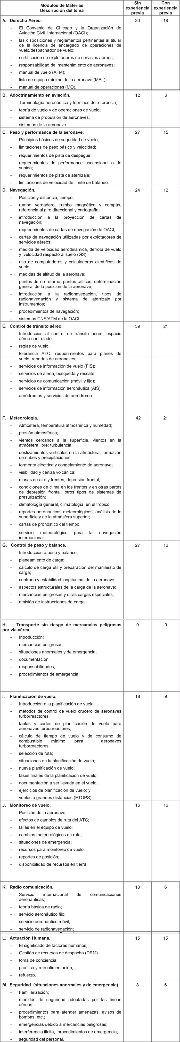 APÉNDICE "G" CURSO PARA ENCARGADO DE OPERACIONES DE VUELO (EOV) (a) Aplicación. Establece los requisitos del curso de formación para obtener la licencia de encargado de operaciones de vuelo. (b) Requisitos de inscripción. Para inscribirse al curso el alumno deberá poseer conocimientos de inglés básico y haber culminado satisfactoriamente como mínimo, la enseñanza media o su equivalente. (c) Definiciones y abreviaturas. Las señaladas en la sección 141.1 de esta norma técnica aeronáutica. (d) Conocimientos teóricos. El curso en tierra para la licencia de despachador de vuelo, comprenderá como mínimo las siguientes materias y se desarrollará en no menos de doscientas ochenta y cinco (285) horas cuando el estudiante no posee experiencia aeronáutica previa en la función o en ciento setenta (170) horas cuando la posee.