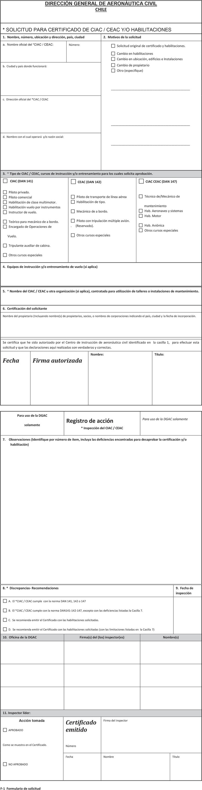 (d) Representante legal; (e) Tipo de CIAC; y (f) Tipo de aeronave si corresponde. 141.7 SOLICITUD OBTENCIÓN O ENMIENDA DEL CERTIFICADO. (a) La solicitud para obtener o enmendar un certificado de Centro de Instrucción de Aeronáutica Civil (CCIAC), debe ser realizada utilizando el formulario contenido en el Apéndice L y proveer la información establecida en el Capítulo B de esta norma. (b) Se podrá modificar o enmendar un CCIAC: (1) Por decisión de la DGAC, en cumplimiento de la normativa vigente; o (2) a solicitud del titular del CCIAC, siempre que se cumpla lo dispuesto en esta norma. 141.9 TIPOS DE CIAC. (a) Los CIAC autorizados bajo esta norma, se clasificarán en tres tipos: (1) CIAC Tipo 1, que imparte solo instrucción teórica; (2) CIAC Tipo 2, que imparte solo instrucción en vuelo; y (3) CIAC Tipo 3, que imparte instrucción mixta (teórica y en vuelo). (b) Debe entenderse que cada Tipo de CIAC señalado anteriormente requiere de una certificación independiente. Solo aquellos requisitos previamente acreditados al obtener una certificación original en algún Tipo de CIAC, se considerarán cumplidos al postularse a una certificación para otro Tipo de CIAC. 141.11 AUTORIDAD DE FISCALIZACIÓN. (a) La DGAC, a través de sus inspectores, podrá realizar fiscalizaciones al CIAC, para determinar el cumplimiento de los requisitos y disposiciones aplicables. (b) Para los efectos de las fiscalizaciones, el titular del CCIAC, deberá permitir el libre acceso de los inspectores a sus registros, programas e instalaciones y dependencias, sean éstas propias o contratadas.