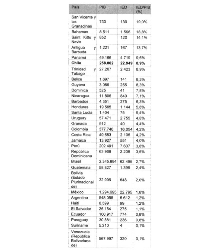 El siguiente cuadro ilustra la aventajada posición de Chile como receptor de flujos de IED: según muestran las cifras, el país cuenta con una de las relaciones IED/PIB más altas de la región. Es a partir de esta realidad que Chile tiene el desafío no sólo de sostener sus altos flujos como receptor, sino también de lograr una mayor vinculación de la IED con su desarrollo económico.