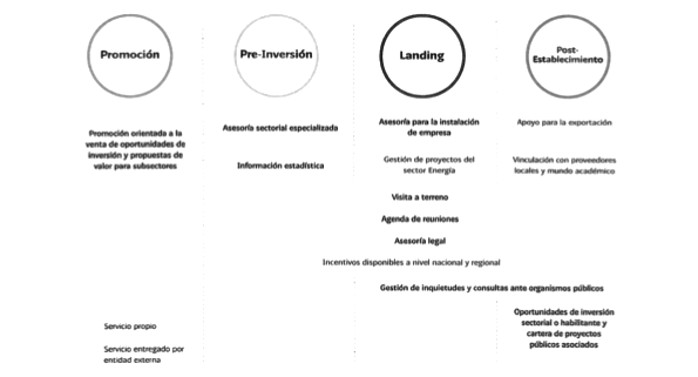 La Agencia de Promoción de la Inversión Extranjera, en línea con las mejores prácticas internacionales, buscará influir de manera efectiva en la decisión de inversión de empresas e inversionistas, apoyando y entregando servicios en las diferentes etapas que componen el ciclo de la promoción de inversiones. En particular se identifican cuatro fases en las que la Agencia de Promoción de la Inversión Extranjera tendrá un rol activo: atracción proactiva de nuevas inversiones, pre-inversión, puesta en marcha (landing) y post-establecimiento. En todas estas etapas, la agencia se enfocará preferentemente en determinadas empresas, de acuerdo a su coherencia con los sectores priorizados, el potencial impacto de sus proyectos y la importancia relativa en términos de empleo y/o monto involucrado.