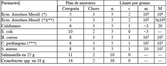 (**) Considerar estos valores, sólo para fórmulas deshidratadas que no contienen leche.