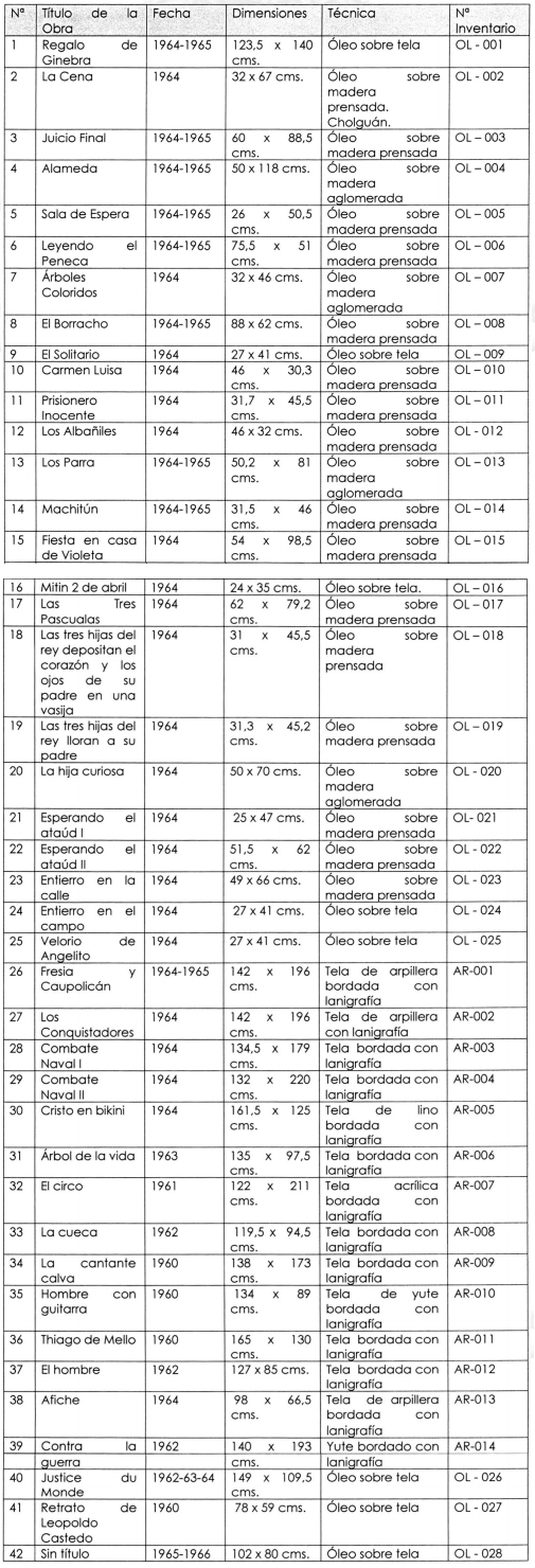 Artículo único.- Declárase monumento nacional en la categoría de monumento histórico, las 42 obras artísticas de Violeta Parra, ubicadas en el Museo de Violeta Parra, situado en Avenida Vicuña Mackenna Nº 37, comuna y provincia de Santiago, Región Metropolitana, que a continuación se indican: