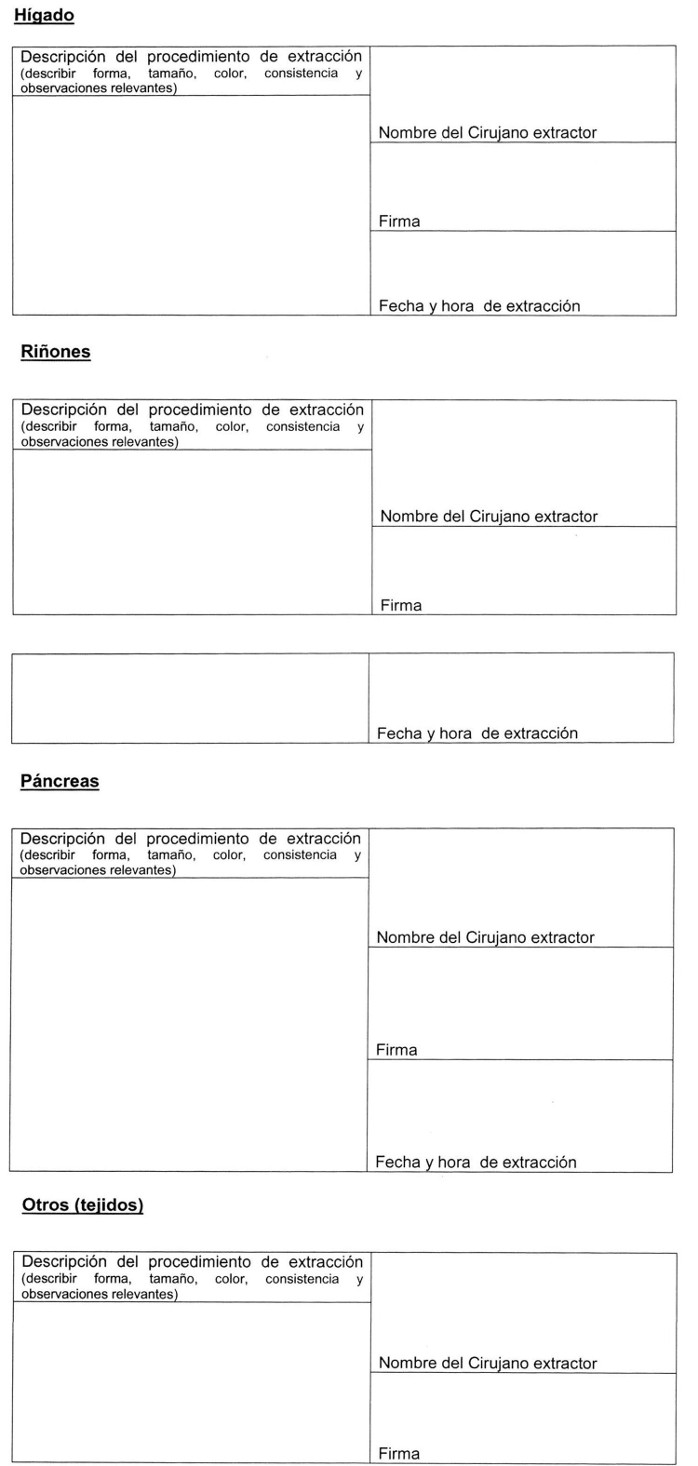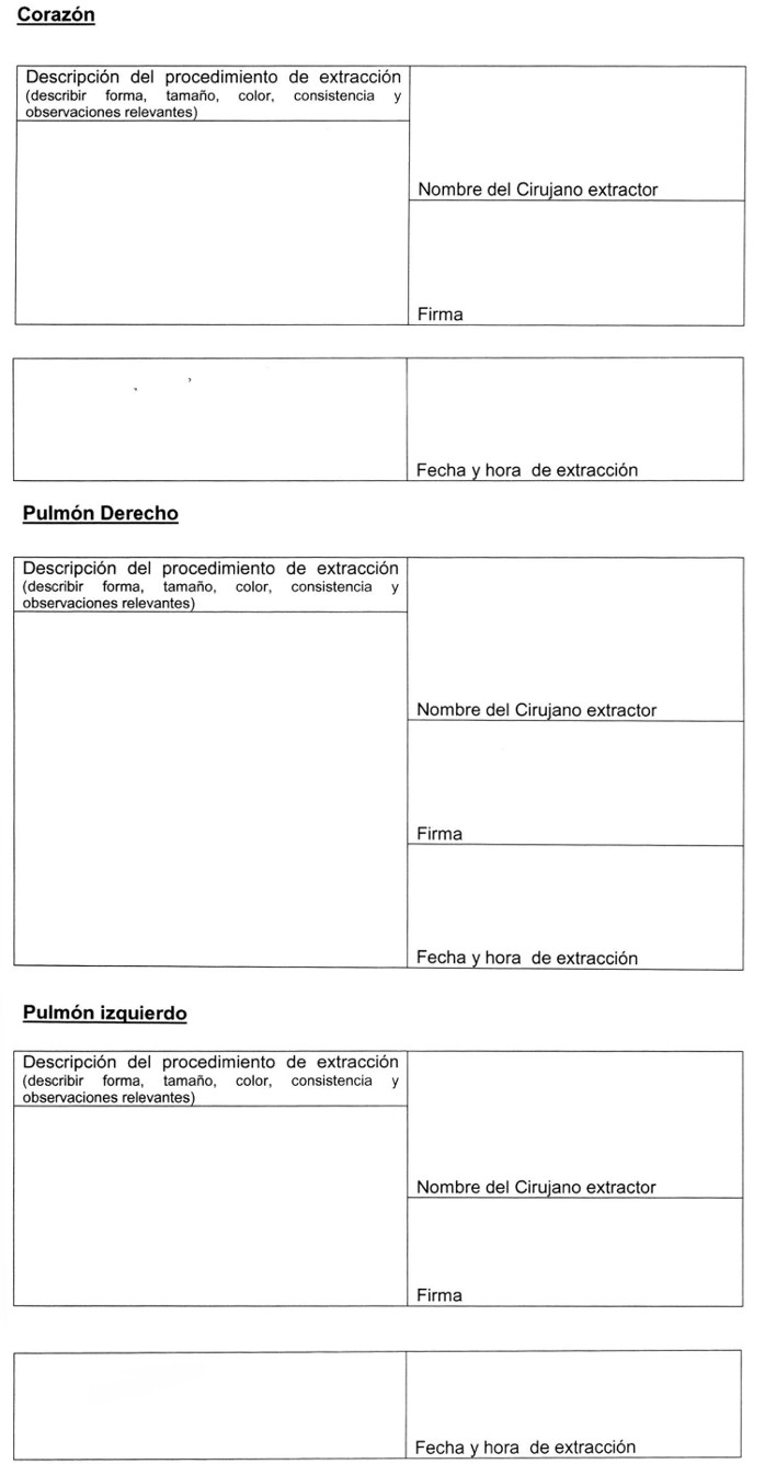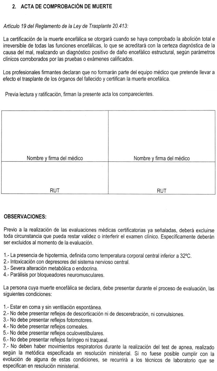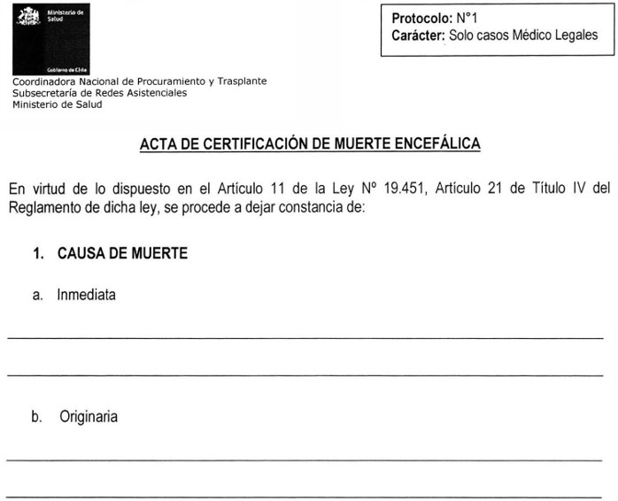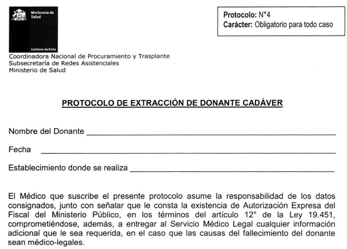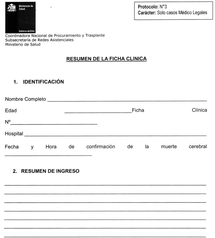7. Asimismo, también se estima útil exista un documento estándar que resuma la ficha clínica para la correcta validación de los antecedentes de los donantes, y un protocolo de extracción de órganos proveniente de un donante cadáver para asegurar la transparencia del proceso de extracción de los órganos y tejidos frente a los establecimientos asistenciales como familiares de donantes involucrados.