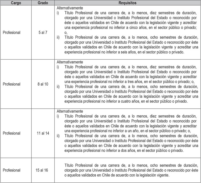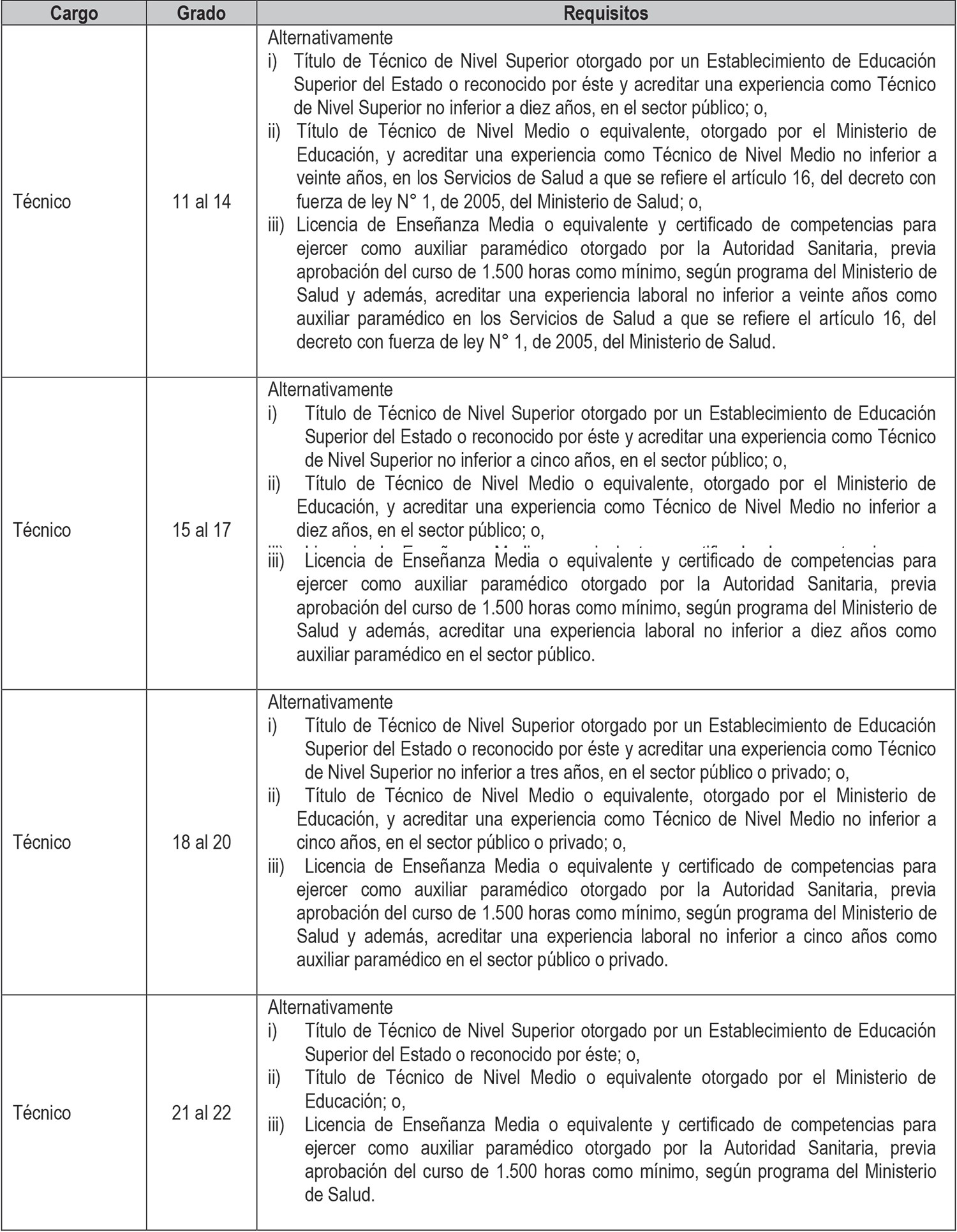 Artículo 2º. Establécense los siguientes requisitos para el ingreso y promoción en las plantas y cargos que se indican a continuación: