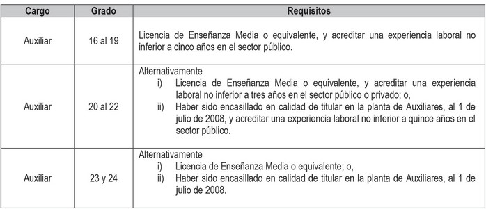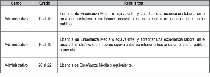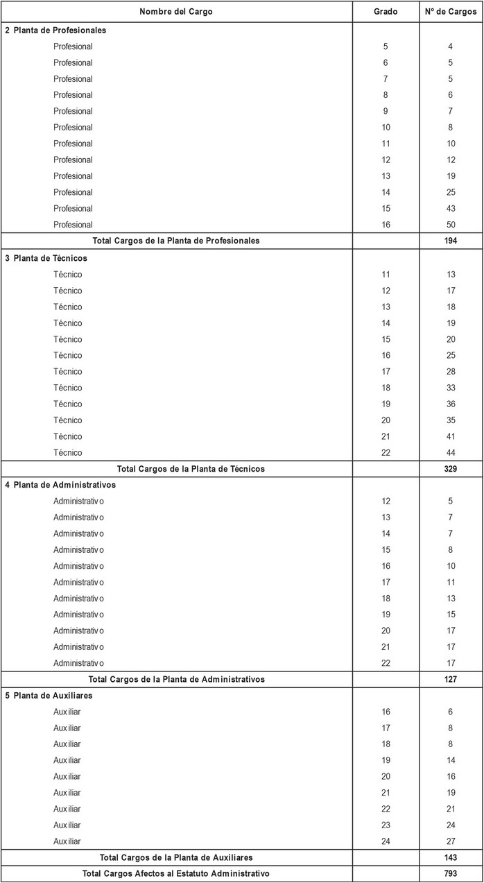 i. Cargos de técnicos, administrativos y auxiliares a proveer, de acuerdo a lo dispuesto en los artículos segundo y tercero transitorios del presente Decreto con Fuerza de Ley, con indicación del número de cargos y su grado.