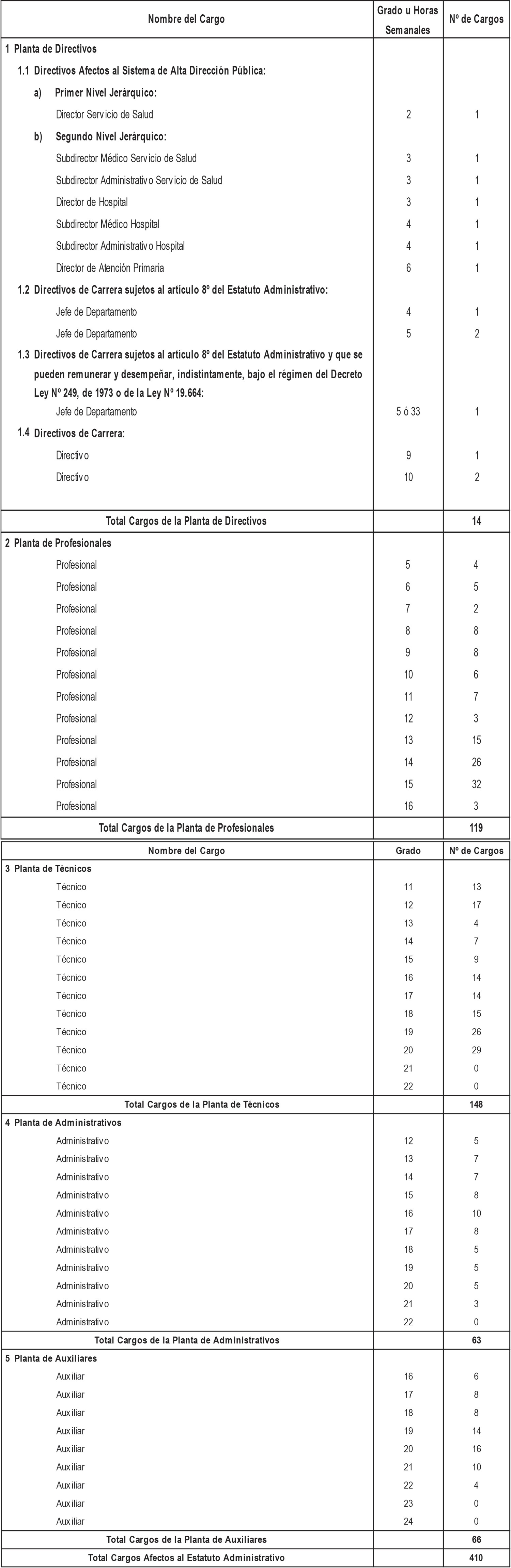 Artículo 1º. Fíjase la Planta de Personal del Servicio de Salud Arica, afecto a las normas del Decreto con Fuerza de Ley Nº29, de 2004, del Ministerio de Hacienda, que fija el texto refundido, coordinado y sistematizado de la Ley Nº18.834, en adelante, Estatuto Administrativo: