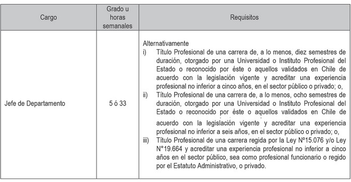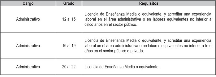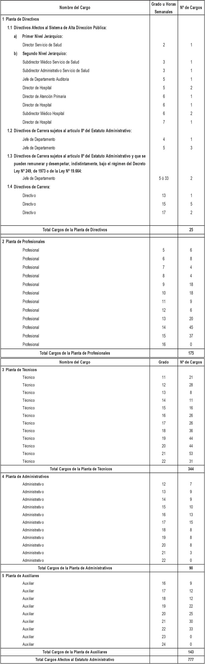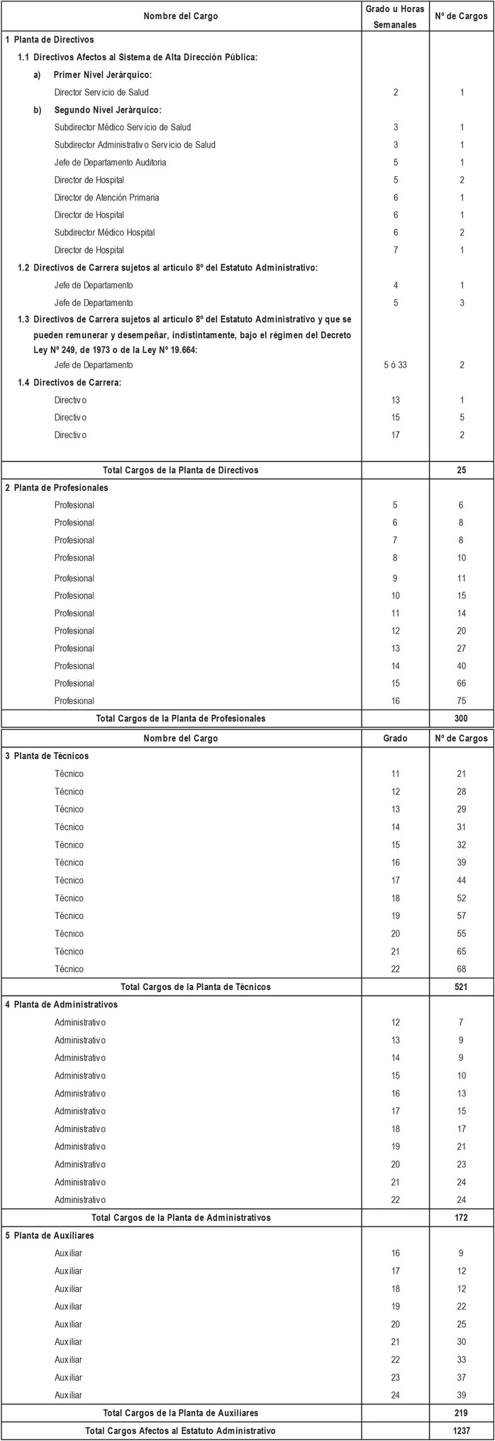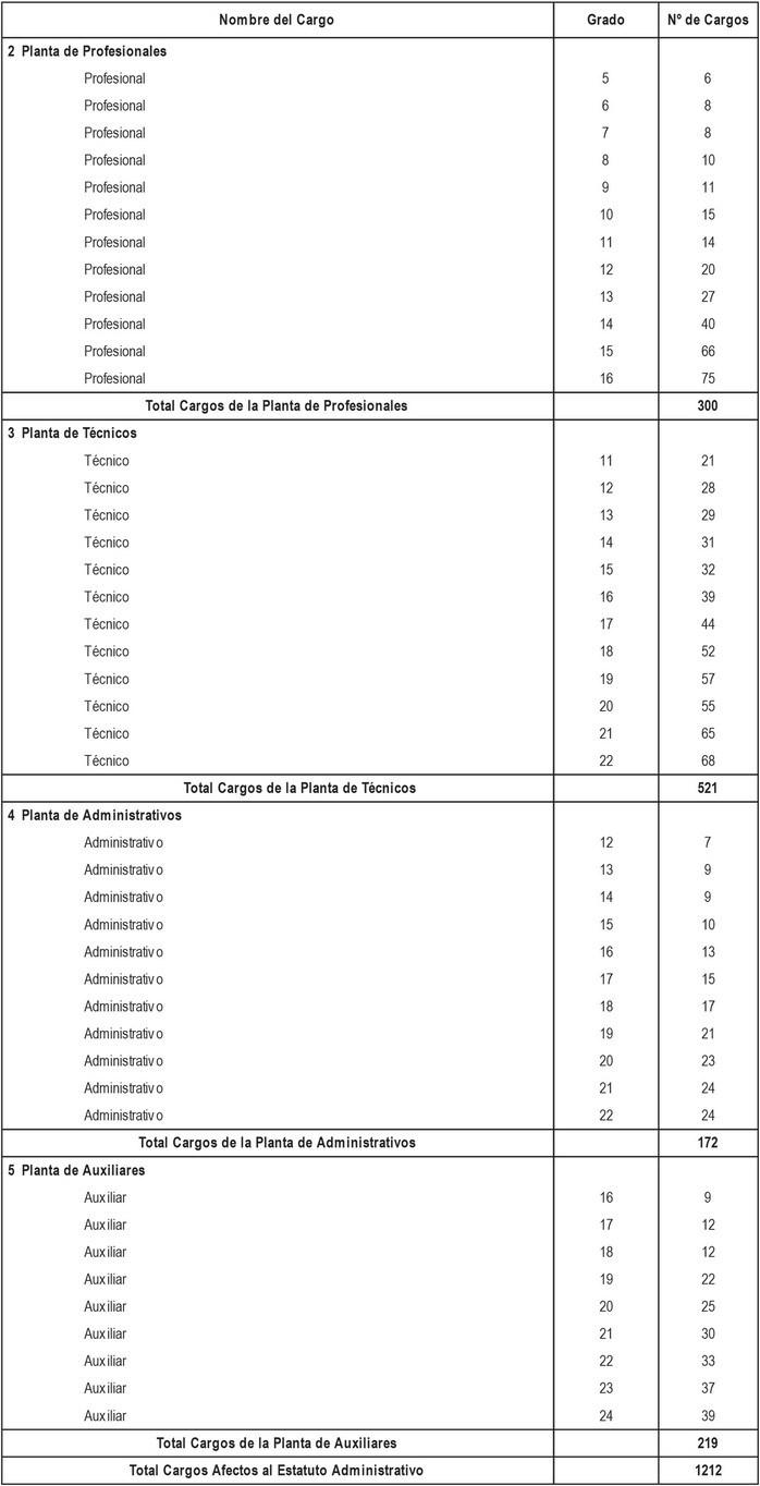 i. Cargos de técnicos, administrativos y auxiliares a proveer, de acuerdo a lo dispuesto en los artículos segundo y tercero transitorios del presente Decreto con Fuerza de Ley, con indicación del número de cargos y su grado.