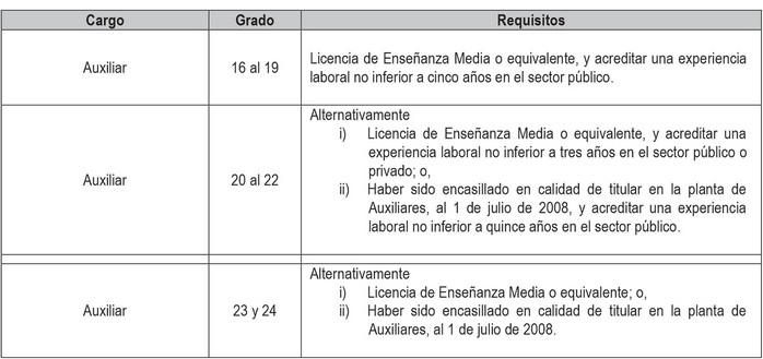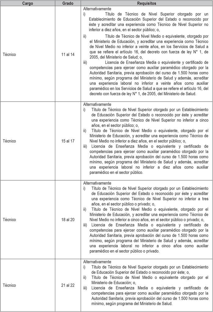 Artículo 2º. Establécense los siguientes requisitos para el ingreso y promoción en las plantas y cargos que se indican a continuación: