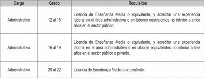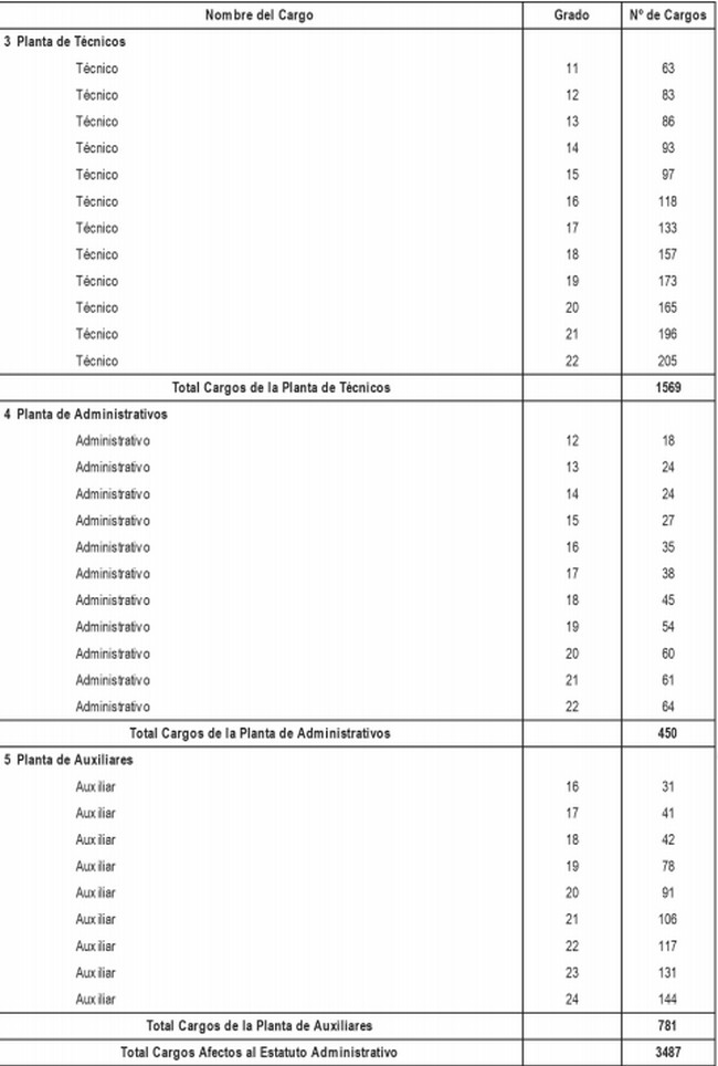 i. Cargos de técnicos, administrativos y auxiliares a proveer, de acuerdo a lo dispuesto en los artículos segundo y tercero transitorios del presente Decreto con Fuerza de Ley, con indicación del número de cargos y su grado.
