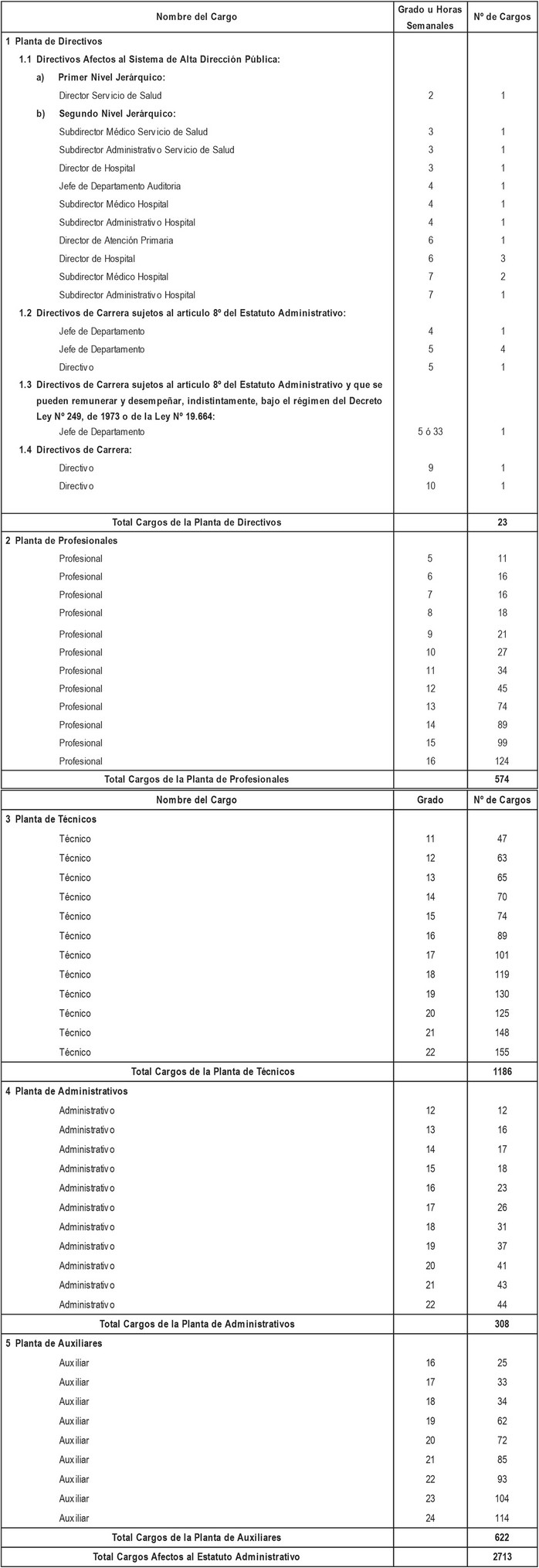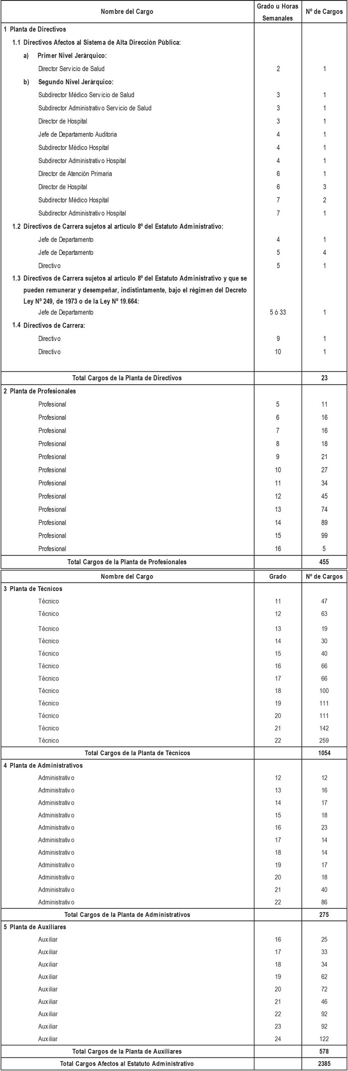 Artículo 1º. Fíjase la Planta de Personal del Servicio de Salud Concepción, afecto a las normas del Decreto con Fuerza de Ley Nº29, de 2004, del Ministerio de Hacienda, que fija el texto refundido, coordinado y sistematizado de la Ley Nº18.834, en adelante, Estatuto Administrativo: