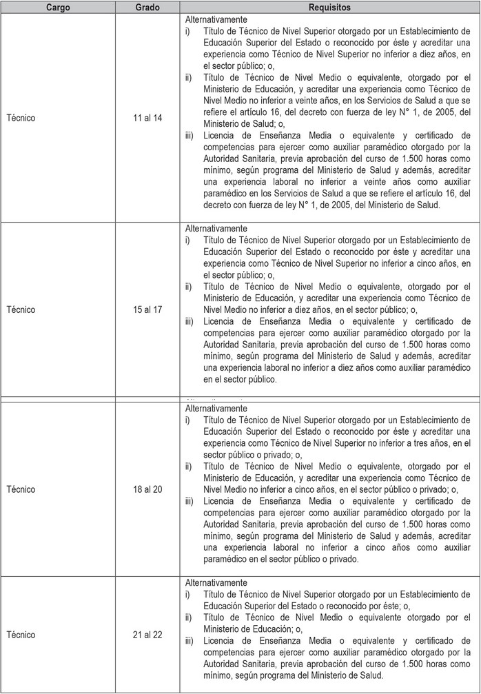 Artículo 2º. Establécense los siguientes requisitos para el ingreso y promoción en las plantas y cargos que se indican a continuación: