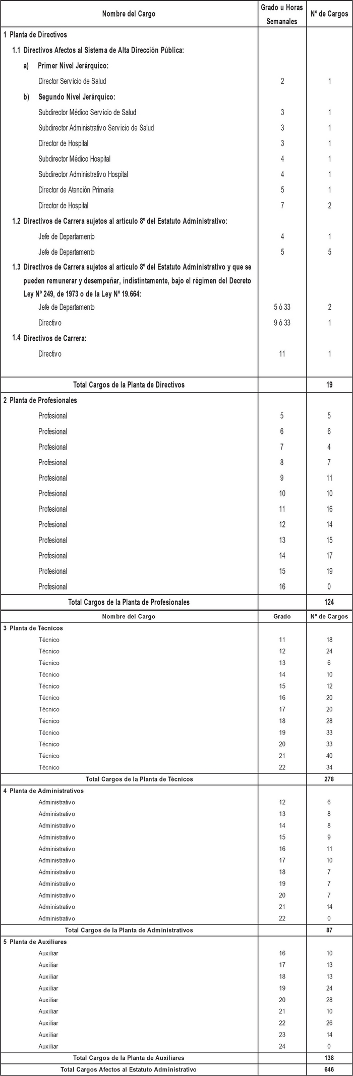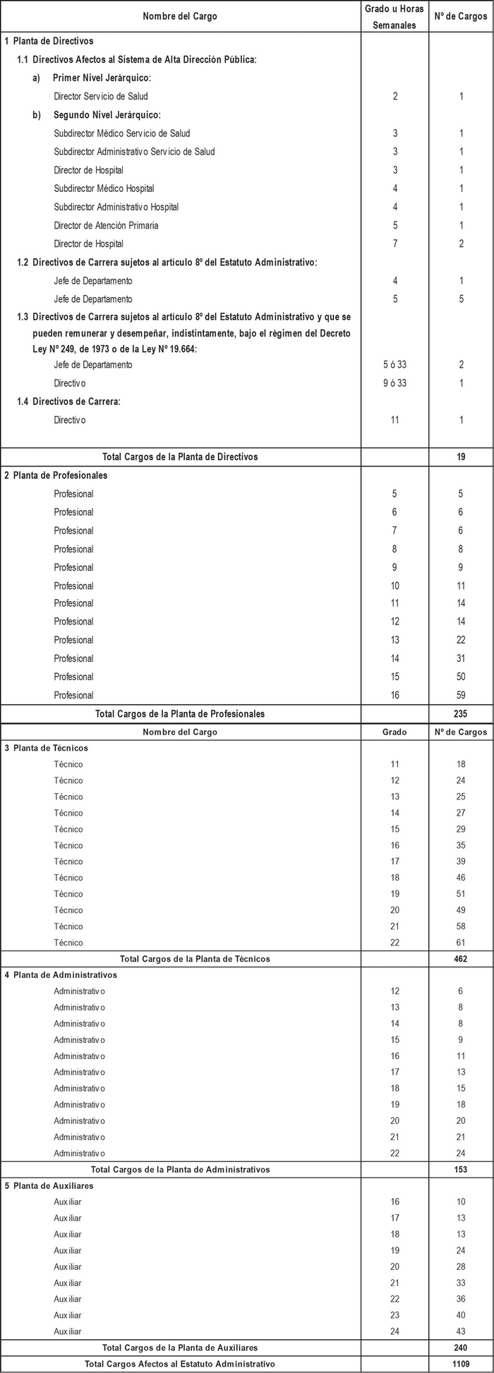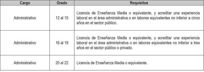 i. Cargos de técnicos, administrativos y auxiliares a proveer, de acuerdo a lo dispuesto en los artículos segundo y tercero transitorios del presente Decreto con Fuerza de Ley, con indicación del número de cargos y su grado.