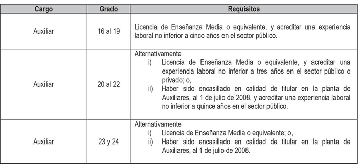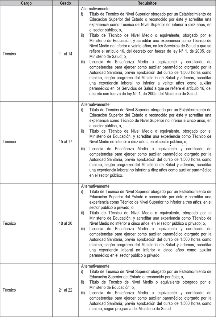 Artículo 2º. Establécense los siguientes requisitos para el ingreso y promoción en las plantas y cargos que se indican a continuación: