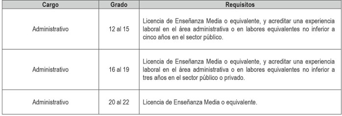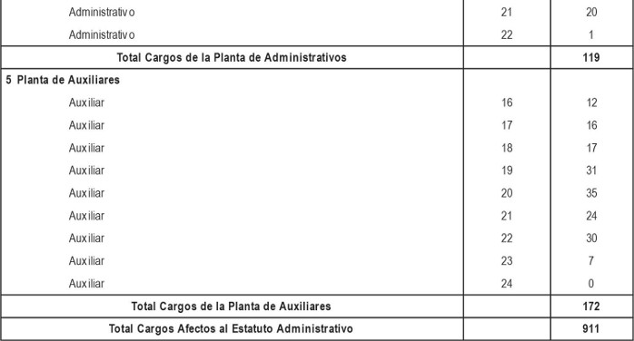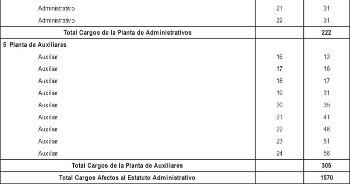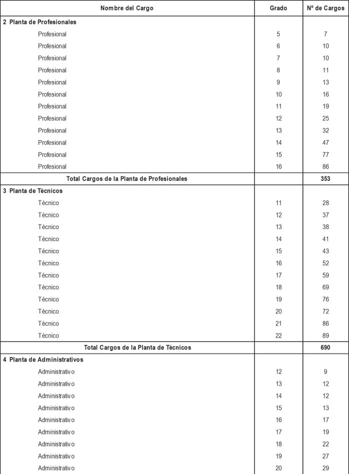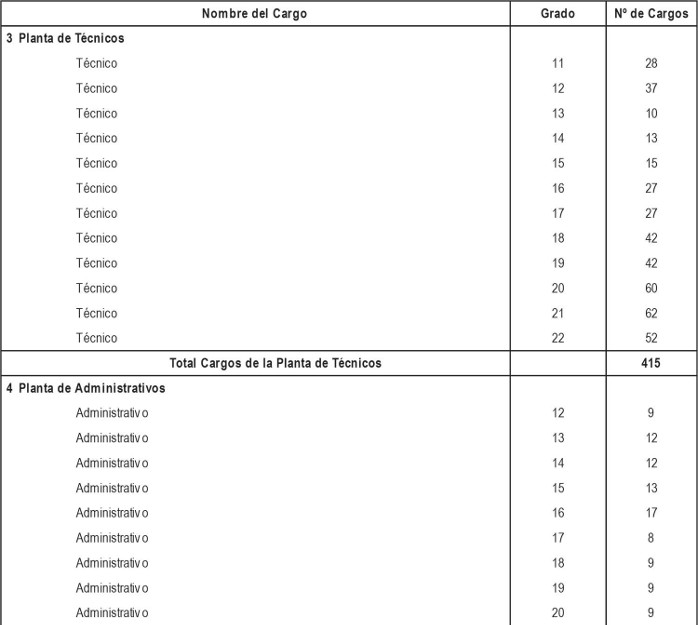 i. Cargos de técnicos, administrativos y auxiliares a proveer, de acuerdo a lo dispuesto en los artículos segundo y tercero transitorios del presente Decreto con Fuerza de Ley, con indicación del número de cargos y su grado.