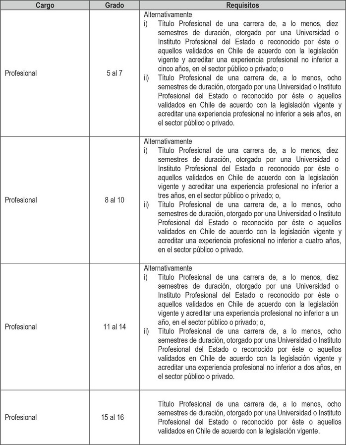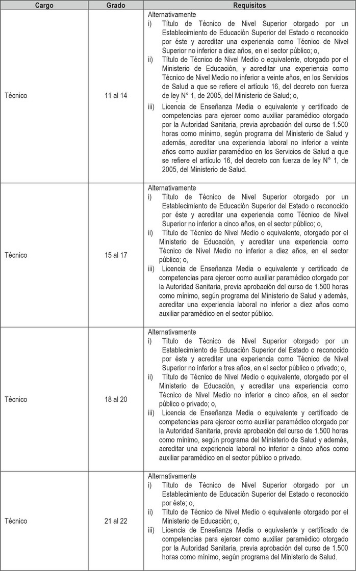 Artículo 2º. Establécense los siguientes requisitos para el ingreso y promoción en las plantas y cargos que se indican a continuación: