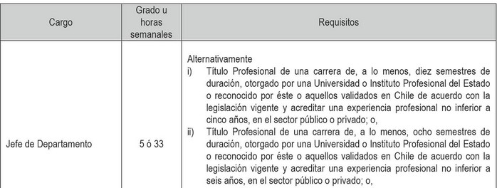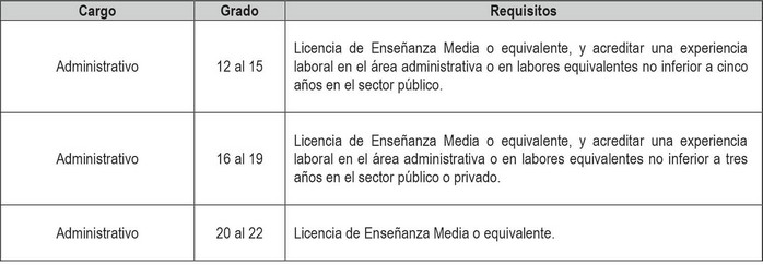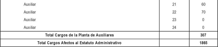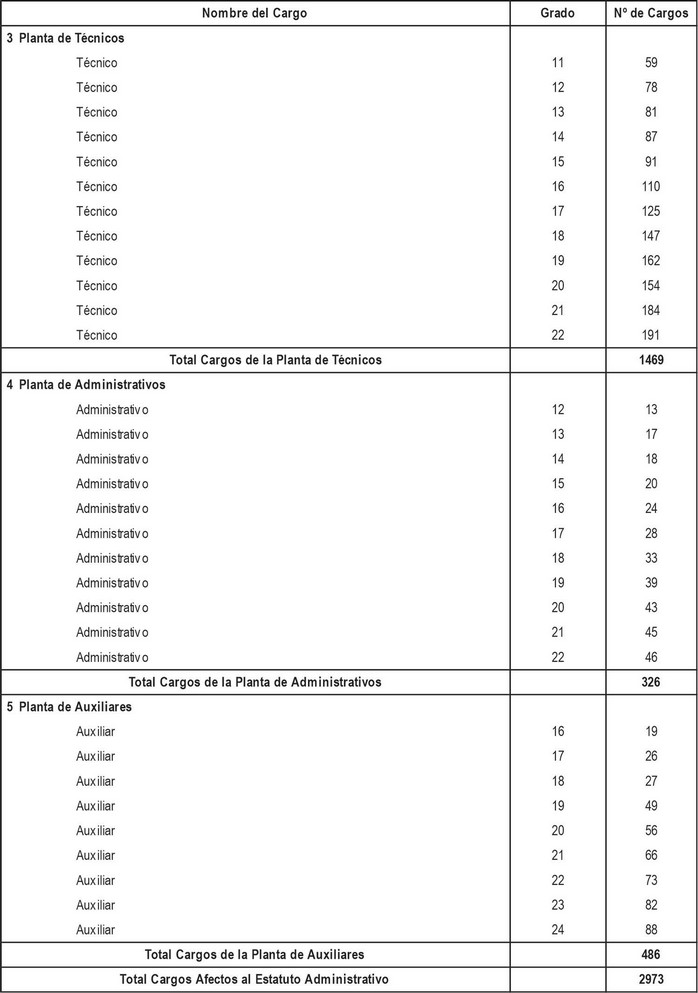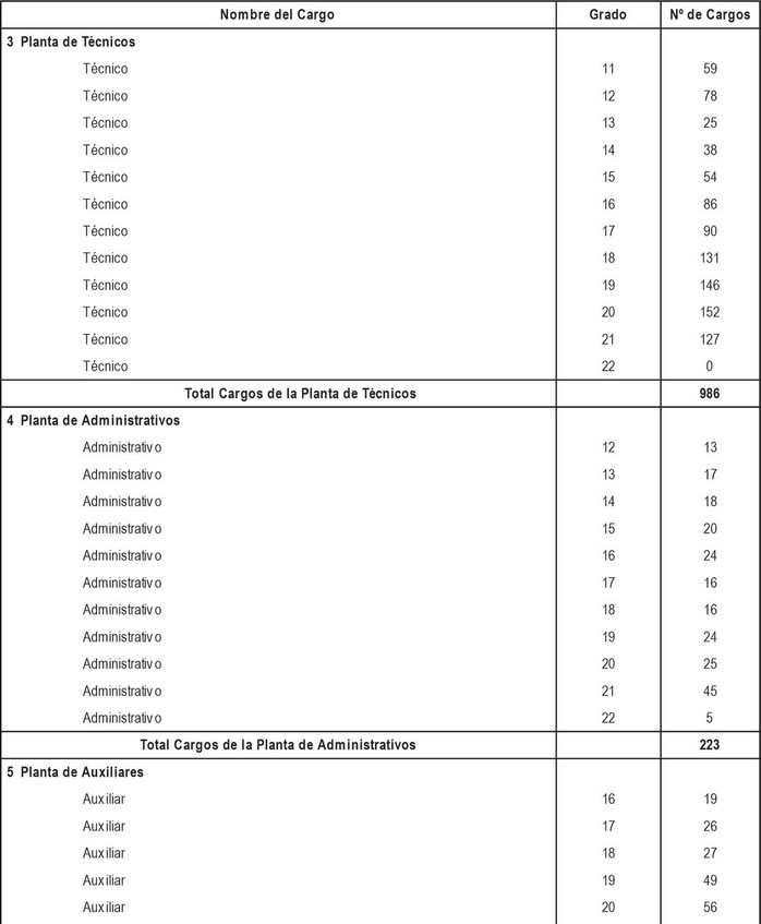 i. Cargos de técnicos, administrativos y auxiliares a proveer, de acuerdo a lo dispuesto en los artículos segundo y tercero transitorios del presente Decreto con Fuerza de Ley, con indicación del número de cargos y su grado.