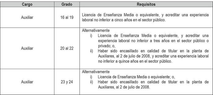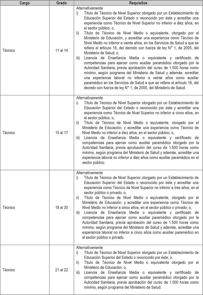 Artículo 2º. Establécense los siguientes requisitos para el ingreso y promoción en las plantas y cargos que se indican a continuación: