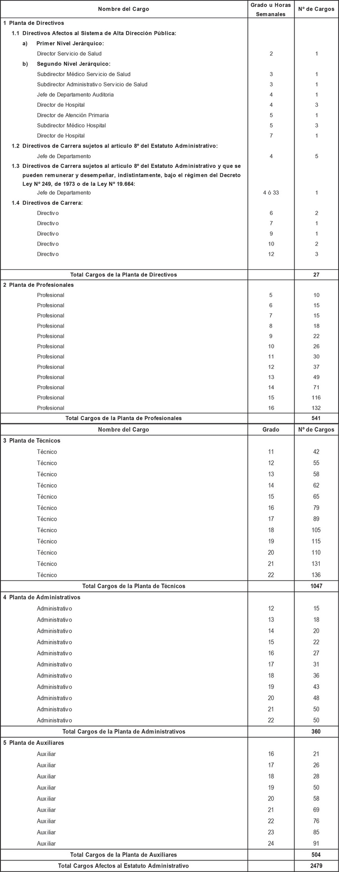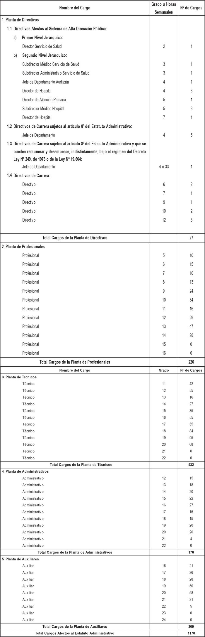 Artículo 1º. Fíjase la Planta de Personal del Servicio de Salud Metropolitano Norte, afecto a las normas del Decreto con Fuerza de Ley Nº29, de 2004, del Ministerio de Hacienda, que fija el texto refundido, coordinado y sistematizado de la Ley Nº18.834, en adelante, Estatuto Administrativo: