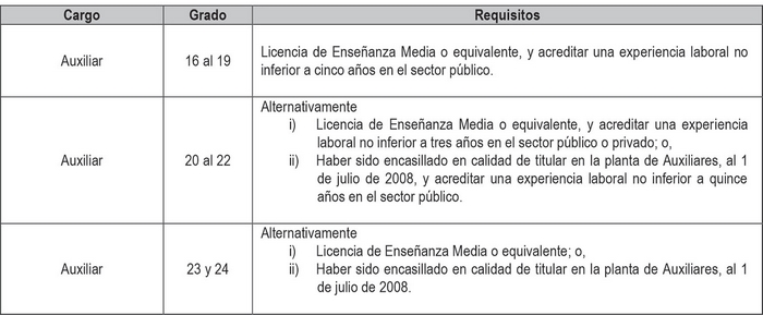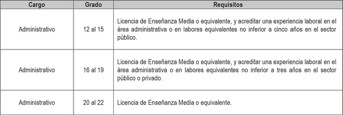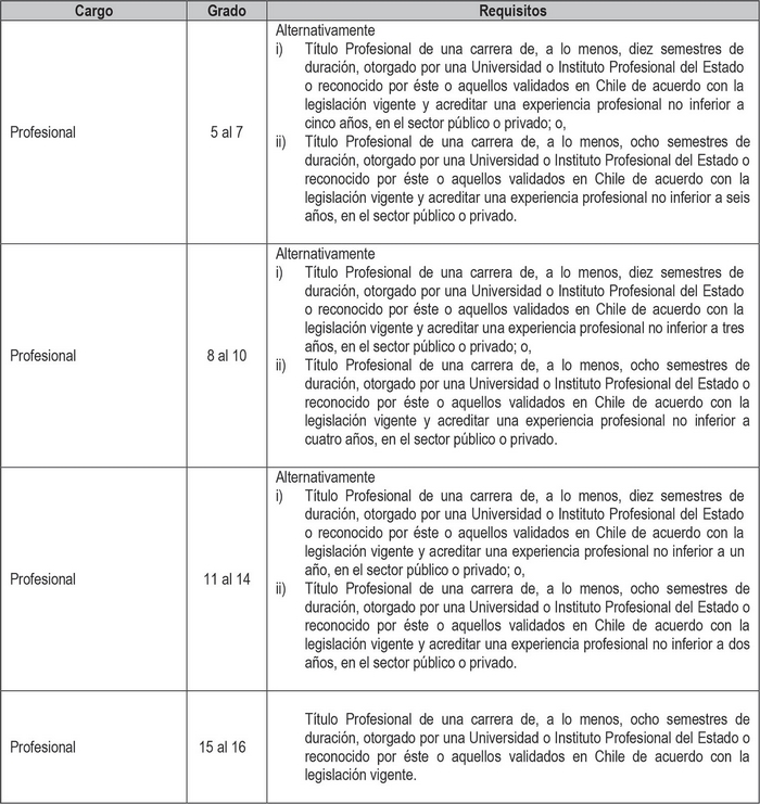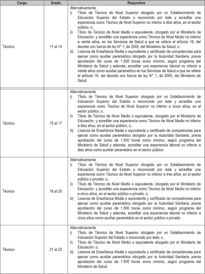 Artículo 2º. Establécense los siguientes requisitos para el ingreso y promoción en las plantas y cargos que se indican a continuación: