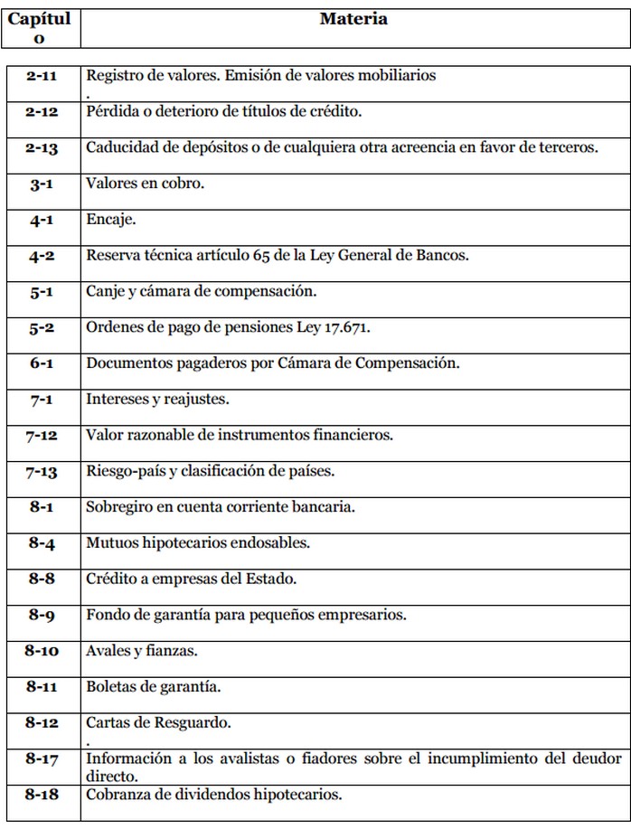Junto con agregarse a la Recopilación Actualizada de Normas el nuevo Capítulo 8-41 y eliminarse los citados Capítulos 2-15 y 8-3, se reemplazan las hojas N°s. 2 y 3 del Índice de Capítulos y las hojas N°s. 5, 6 y 18 del Índice por Materias