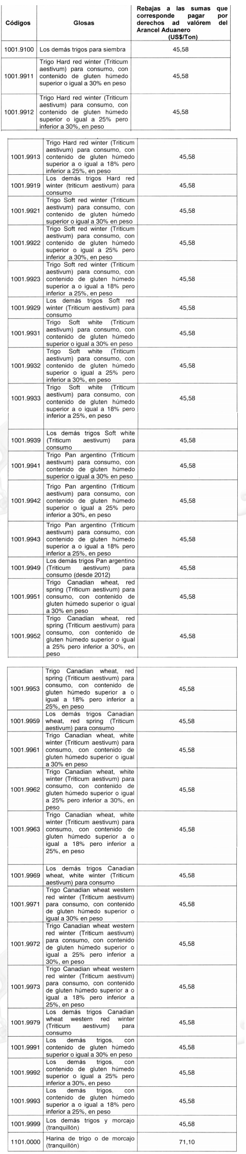 APLICA REBAJAS DE DERECHOS DE ADUANA PARA LA IMPORTACIÓN DE TRIGO Y HARINA DE TRIGO O DE MORCAJO (TRANQUILLÓN)